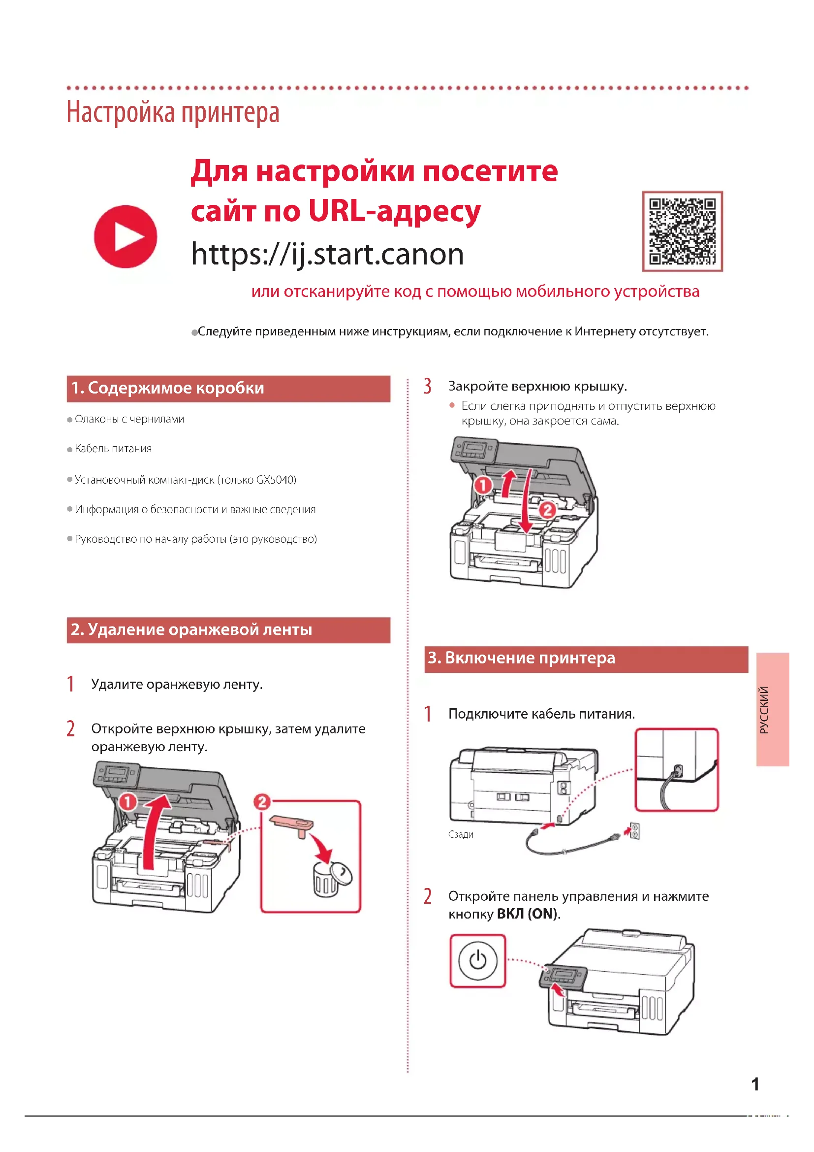 Флаконы с чернилами Кабель питания Установочный компакт-диск (только GX5040) Информация о безопасности и важные сведения Руководство по началу работы (это руководство)