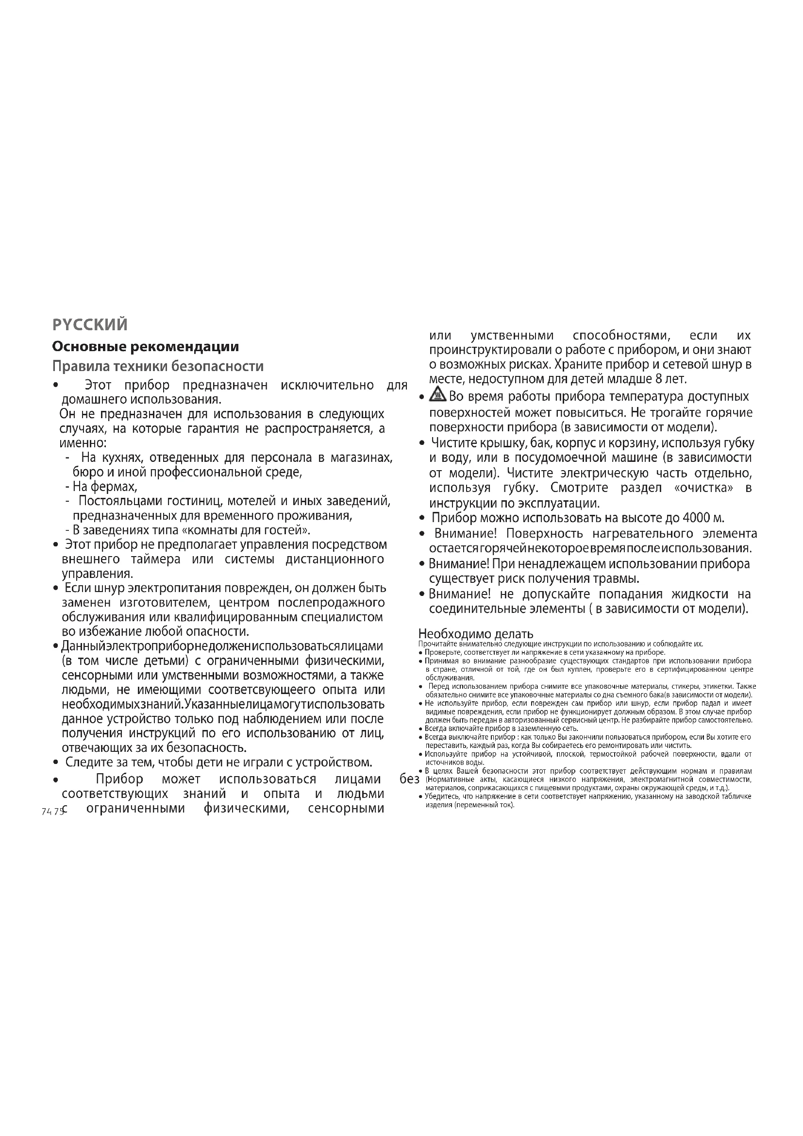 Прибор может использоваться лицами без соответствующих знаний и опыта и людьми с ограниченными физическими, сенсорными PYCCKИЙ или умственными способностями, если их проинструктировали о работе с прибором, и они знают о возможных рисках. Храните прибор и сетевой шнур в месте, недоступном для детей младше 8 лет.