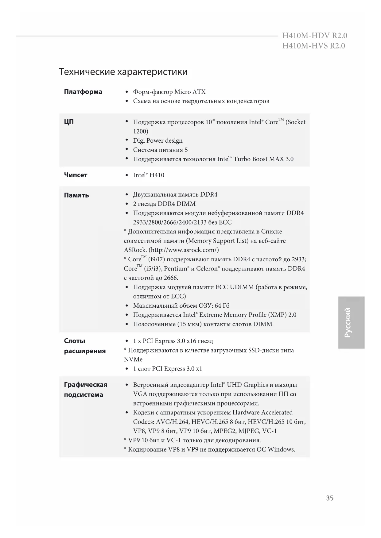 Отображение и безопасность содержания: Rec. 2020 (широкая цветовая гамма), Microso PlayReady 3.0, Защита содержания Intel® SGX, Диск UHD/HDR Blu-ray H410M-HDV R2.0: