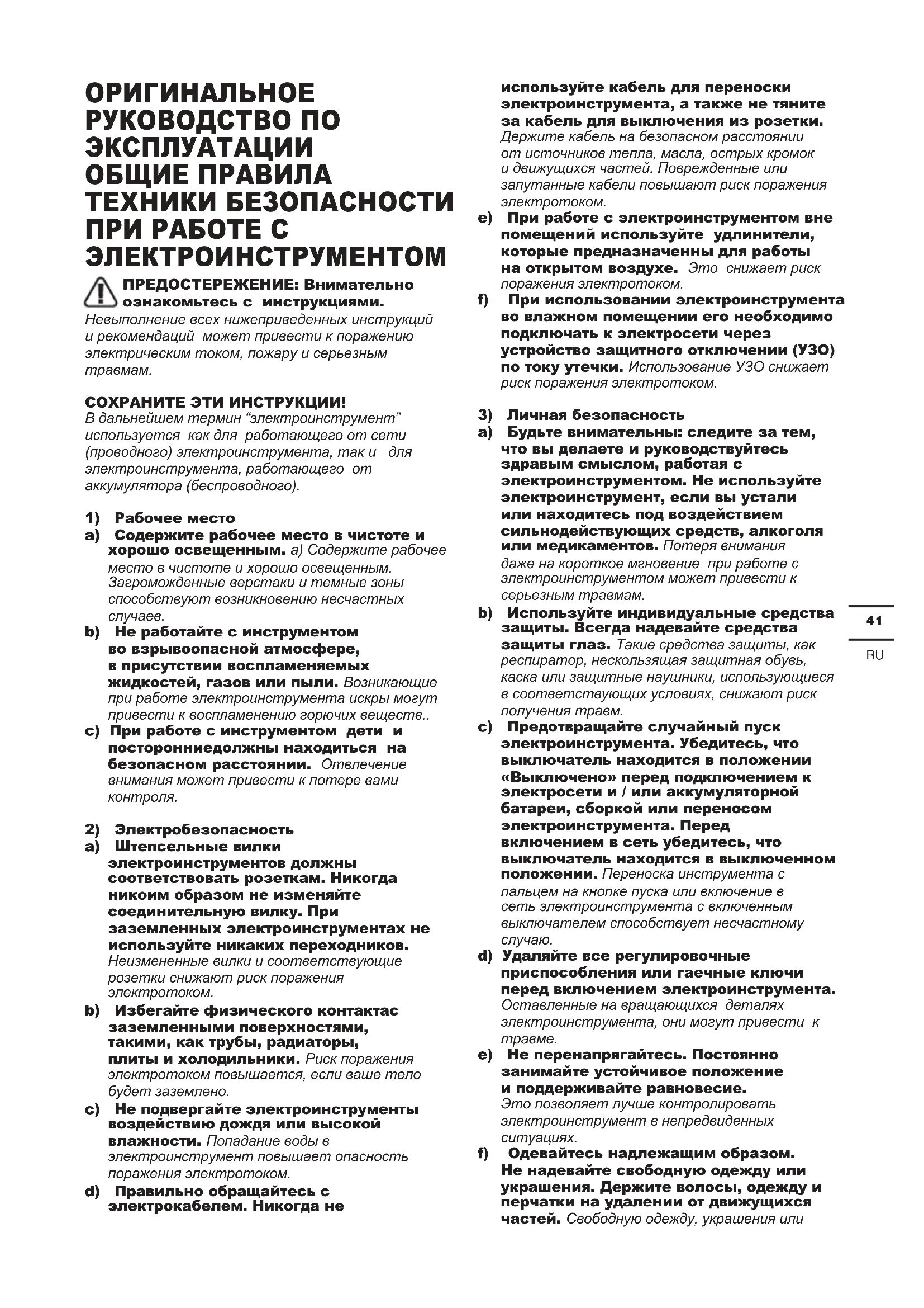 ОРИГИНАЛЬНОЕ РУКОВОДСТВО ПО ЭКСПЛУАТАЦИИ ОБЩИЕ ПРАВИЛА ТЕХНИКИ БЕЗОПАСНОСТИ ПРИ РАБОТЕ С ЭЛЕКТРОИНСТРУМЕНТОМ ПРЕДОСТЕРЕЖЕНИЕ: Внимательно ознакомьтесь с инструкциями. Невыполнение всех нижеприведенных инструкций и рекомендаций может привести к поражению электрическим током, пожару и серьезным