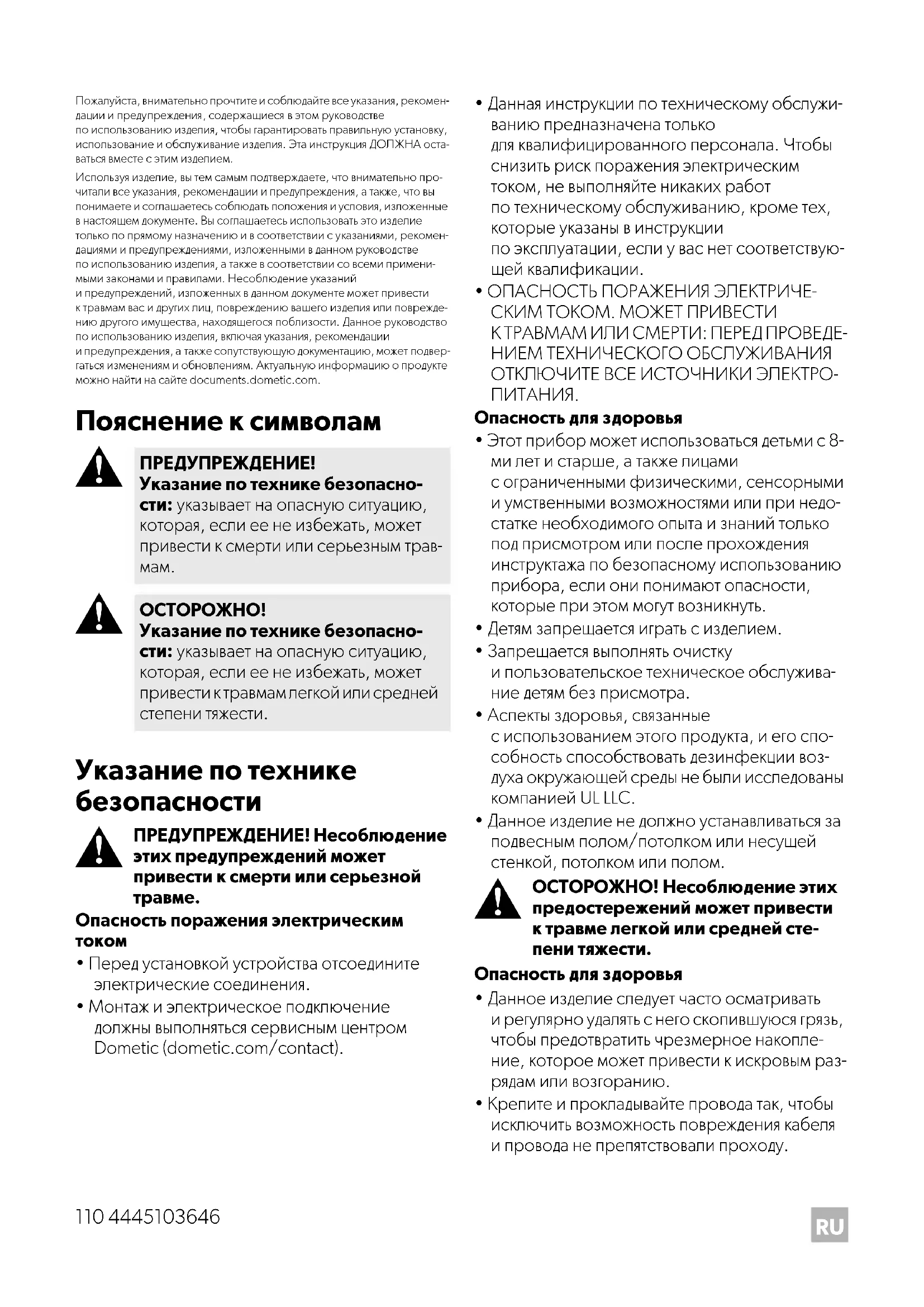 Пожалуйста, внимательно прочтите и соблюдайте все указания, рекомен- дации и предупреждения, содержащиеся в этом руководстве по использованию изделия, чтобы гарантировать правильную установку, использование и обслуживание изделия. Эта инструкция ДОЛЖНА оста-ваться вместе с этим изделием.Используя изделие, вы тем самым подтверждаете, что внимательно про- читали все указания, рекомендации и предупреждения, а также, что вы понимаете и соглашаетесь соблюдать положения и условия, изложенные в настоящем документе. Вы соглашаетесь использовать это изделие только по прямому назначению и в соответствии с указаниями, рекомен- дациями и предупреждениями, изложенными в данном руководстве по использованию изделия, а также в соответствии со всеми примени- мыми законами и правилами. Несоблюдение указаний и предупреждений, изложенных в данном документе может привести к травмам вас и других лиц, повреждению вашего изделия или поврежде- нию другого имущества, находящегося поблизости. Данное руководство по использованию изделия, включая указания, рекомендации и предупреждения, а также сопутствующую документацию, может подвер- гаться изменениям и обновлениям. Актуальную информацию о продукте можно найти на сайте documents.dometic.com. Пояснение к символам