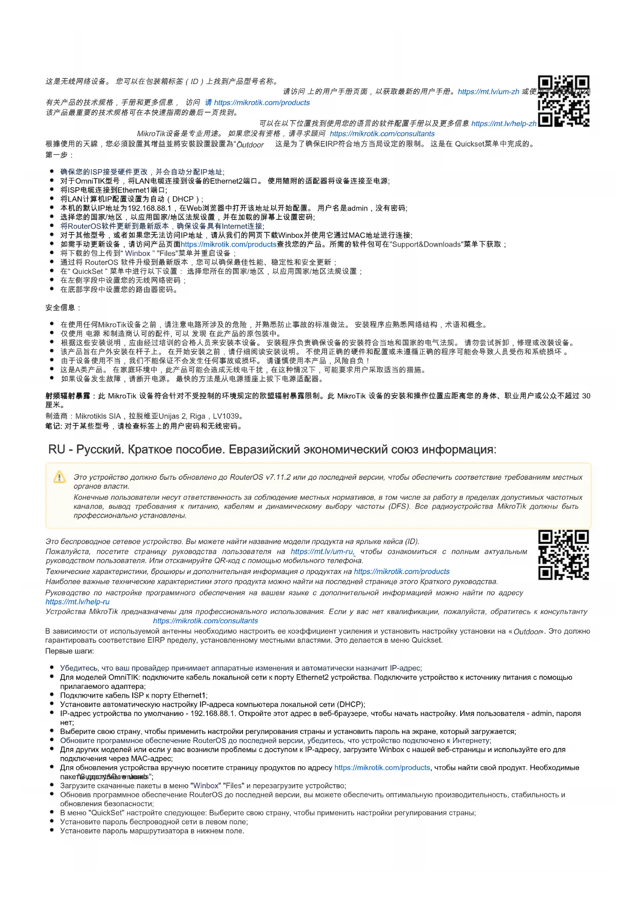 Это беспроводное сетевое устройство. Вы можете найти название модели продукта на ярлыке кейса (ID). Пожалуйста, посетите страницу руководства пользователя на чтобы ознакомиться с полным актуальнымhttps://mt.lv/um-ru, руководством пользователя. Или отсканируйте QR-код с помощью мобильного телефона. Технические характеристики, брошюры и дополнительная информация о продуктах на https://mikrotik.com/products Наиболее важные технические характеристики этого продукта можно найти на последней странице этого Краткого руководства. Руководство по настройке программного обеспечения на вашем языке с дополнительной информацией можно найти по адресу https://mt.lv/help-ru Устройства MikroTik предназначены для профессионального использования. Если у вас нет квалификации, пожалуйста, обратитесь к консультанту https://mikrotik.com/consultants В зависимости от используемой антенны необходимо настроить ее коэффициент усиления и установить настройку установки на « ». Это должно Outdoor гарантировать соответствие EIRP пределу, установленному местными властями. Это делается в меню Quickset. Первые шаги: Убедитесь, что ваш провайдер принимает аппаратные изменения и автоматически назначит IP-адрес; Для моделей OmniTIK: подключите кабель локальной сети к порту Ethernet2 устройства.Подключите устройство к источнику питания с помощью прилагаемого адаптера; Подключите кабель ISP к порту Ethernet1; Установите автоматическую настройку IP-адреса компьютера локальной сети (DHCP); IP-адрес устройства по умолчанию - 192.168.88.1. Откройте этот адрес в веб-браузере, чтобы начать настройку.Имя пользователя - admin, пароля