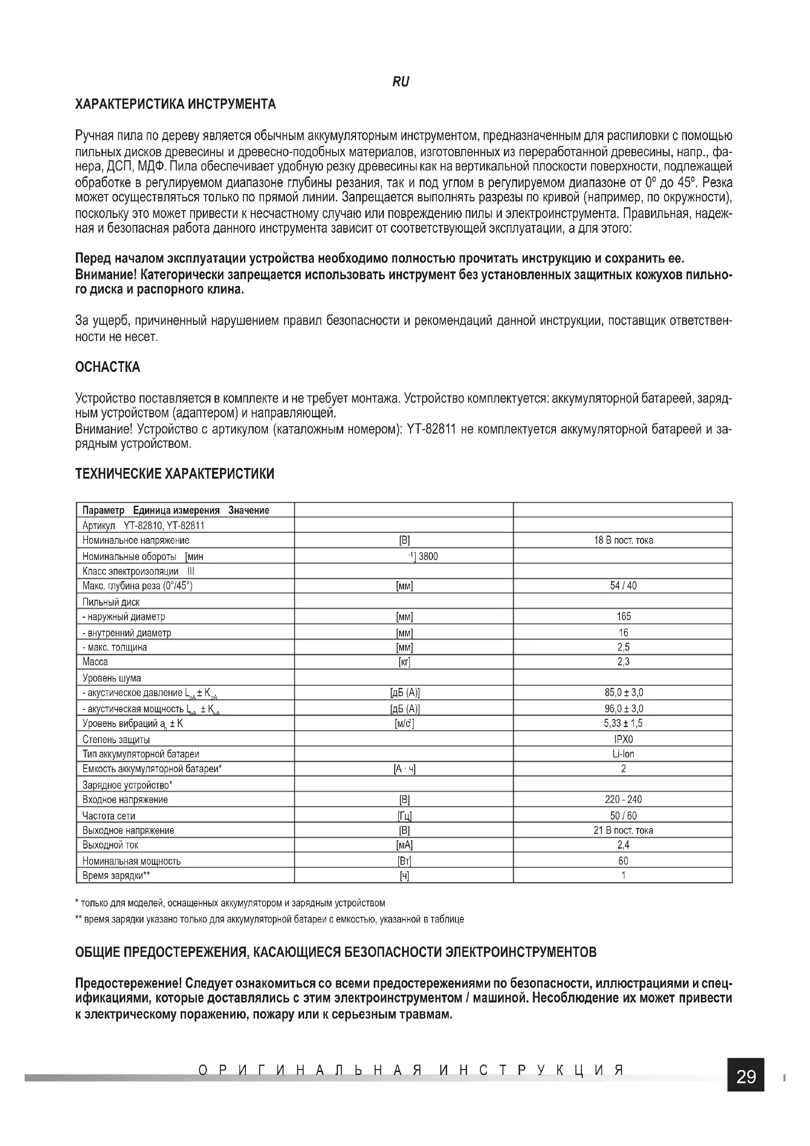 Устройство поставляется в комплекте и не требует монтажа. Устройство комплектуется: аккумуляторной батареей, заряд- ным устройством (адаптером) и направляющей. Внимание! Устройство с артикулом (каталожным номером): YT-82811 не комплектуется аккумуляторной батареей и за- рядным устройством. ТЕХНИЧЕСКИЕ ХАРАКТЕРИСТИКИ Параметр Единица измерения Значение Артикул YT-82810, YT-82811 Номинальное напряжение [В] 18 В пост. тока Номинальные обороты [мин