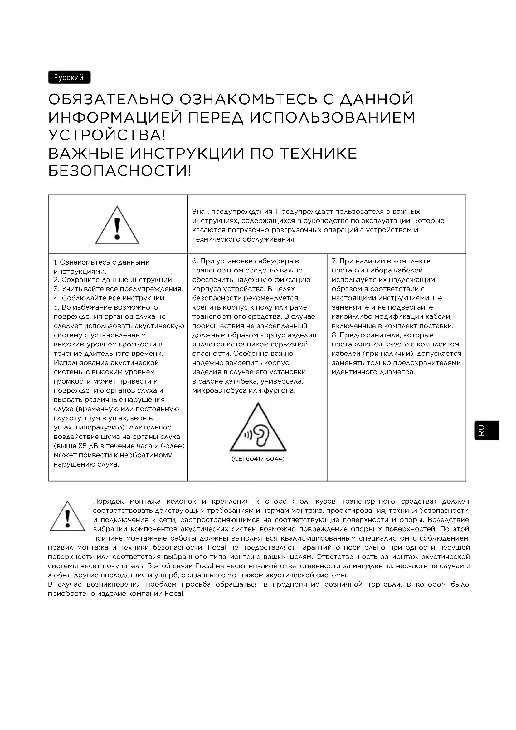 поставляются вместе с комплектом кабелей (при наличии), допускается заменять только предохранителями идентичного диаметра. (CEI 60417-6044) Порядок монтажа колонок и крепления к опоре (пол, кузов транспортного средства) должен соответствовать действующим требованиям и нормам монтажа, проектирования, техники безопасности и подключения к сети, распространяющимся на соответствующие поверхности и опоры. Вследствие вибрации компонентов акустических систем возможно повреждение опорных поверхностей. По этой причине монтажные работы должны выполняться квалифицированным специалистом с соблюдением правил монтажа и техники безопасности. Focal не предоставляет гарантий относительно пригодности несущей поверхности или соответствия выбранного типа монтажа вашим целям. Ответственность за монтаж акустической системы несет покупатель. В этой связи Focal не несет никакой ответственности за инциденты, несчастные случаи и любые другие последствия и ущерб, связанные с монтажом акустической системы. В случае возникновения проблем просьба обращаться в предприятие розничной торговли, в котором было приобретено изделие компании Focal.RU Для подтверждения гарантии Focal-JMlab теперь можно зарегистрировать покупку онлайн: www.focal.com/garantie В целях улучшения изделия или соблюдения нормативно-правовых требований компания Focal-JMlab вправе изменять технические спецификации своих изделий без предварительного уведомления. В соответствующих случаях изображения приводятся исключительно в иллюстративных целях и могут отличаться от приобретенного изделия. Благодарим вас за покупку изделия Focal. Надеемся, что вы по достоинству оцените применимые нами технологии высокой точности. Мы ценим новаторство, традиции и превосходное качество и стремимся к тому, чтобы вы получали удовольствие от прослушивания. Наша единственная цель— добиться чистоты, достоверности и красоты звучания. Для того чтобы в полной мере использовать все характеристики изделия, внимательно ознакомьтесь с настоящими инструкциями и сохраните их для использования в будущем. ВАЖНЫЕ РЕКОМЕНДАЦИИ Прежде всего удостоверьтесь в наличии места для установки громкоговорителей (см. план установки на упаковке), а затем переходите к вырезанию. В случае установки громкоговорителей в специально предусмотренное для них место удостоверьтесь, что между громкоговорителем и защитной сеткой достаточно места.