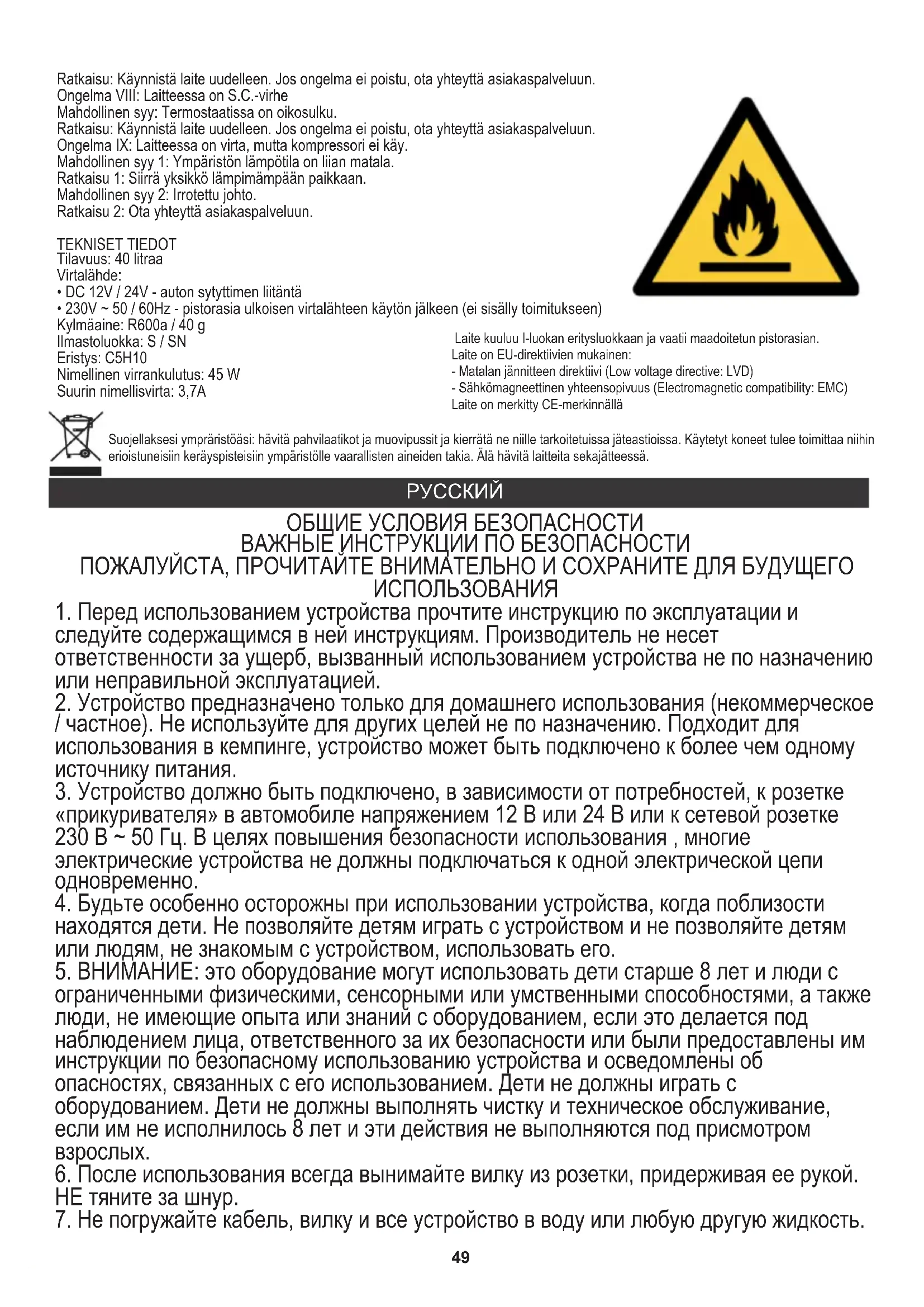 - Мороженое (-15 ℃) Будьте осторожны, если хотите хранить лекарства в холодильнике. Перед помещением в устройство храните продукты в предназначенных для этого контейнерах / пакетах. ЧИСТКА И УХОД Перед чисткой всегда отключайте устройство от сети. Протрите мягкой сухой тканью. Не используйте химические растворители, поскольку они могут вызвать необратимое повреждение или деформацию устройства. ИСПРАВЛЕНИЕ ПРОБЛЕМ Следуйте приведенному ниже руководству по устранению неполадок, чтобы решить типичные проблемы. Проблема 1. Устройство не работает и не показывает никаких признаков питания. Возможная причина 1: устройство не получает питание. Решение для возможной причины 1. Убедитесь, что устройство подключено к электросети. Возможная причина 2: недостаточная мощность. Решение для возможной причины 2: переместите устройство в другую розетку. Проверьте свой автоматический выключатель. (См. Паспортную табличку на задней панели устройства для определения силы тока). Возможная причина 4: шнур питания постоянного тока Решение для возможной причины 4. Протестируйте устройство с другим источником питания, например. другой автомобиль с заведомо исправной розеткой постоянного тока. Возможная причина 5: Отсоединенные провода. Решение для возможной причины 5. Обратитесь в службу поддержки. Проблема II: Устройство издает странные звуки. Возможная причина 1: установка неровная. Решение 1. Переместите устройство на ровную ровную поверхность. Проблема III: Устройство издает громкий непрерывный металлический стук или свистящий звук. Возможная причина 1. Возможно, устройство было доставлено на боку. Решение 1. Выключите агрегат. Дайте устройству постоять на ровной поверхности не менее 24 часов и перезапустите. Возможная причина 2: поврежден компрессор Решение 2. Обратитесь в службу поддержки. Решение: обратитесь к электрику, если блок работает в другом помещении или в другом месте. Проблема V: Индикаторы панели управления мигают случайным образом. Возможная причина: Возможно, в установке неисправна панель управления. Решение: перезапустите устройство и, если проблема не исчезнет, обратитесь в службу поддержки. Проблема VI: В устройстве есть ошибка HH Возможная причина: Температура окружающей среды превысила 40 ℃. Решение: перезапустите устройство и, если проблема не исчезнет, обратитесь в службу поддержки. Проблема VII: В устройстве есть ошибка OC. Возможная причина: обнаружена ошибка термостата. Решение: перезапустите устройство и, если проблема не исчезнет, обратитесь в службу поддержки. Проблема VIII: у объекта есть ошибка S.C. Возможная причина: обнаружено короткое замыкание в термостате. Решение: перезапустите устройство и, если проблема не исчезнет, обратитесь в службу поддержки. Проблема IX: На агрегат подается питание, но компрессор не работает. Возможная причина 1: слишком низкая температура окружающей среды. Решение 1. Переместите устройство в более теплое место. Возможная причина 2: Отсоединенный провод. Решение 2. Обратитесь в службу поддержки клиентов. ТЕХНИЧЕСКИЕ ДАННЫЕ Емкость: 40 литров Источник питания: