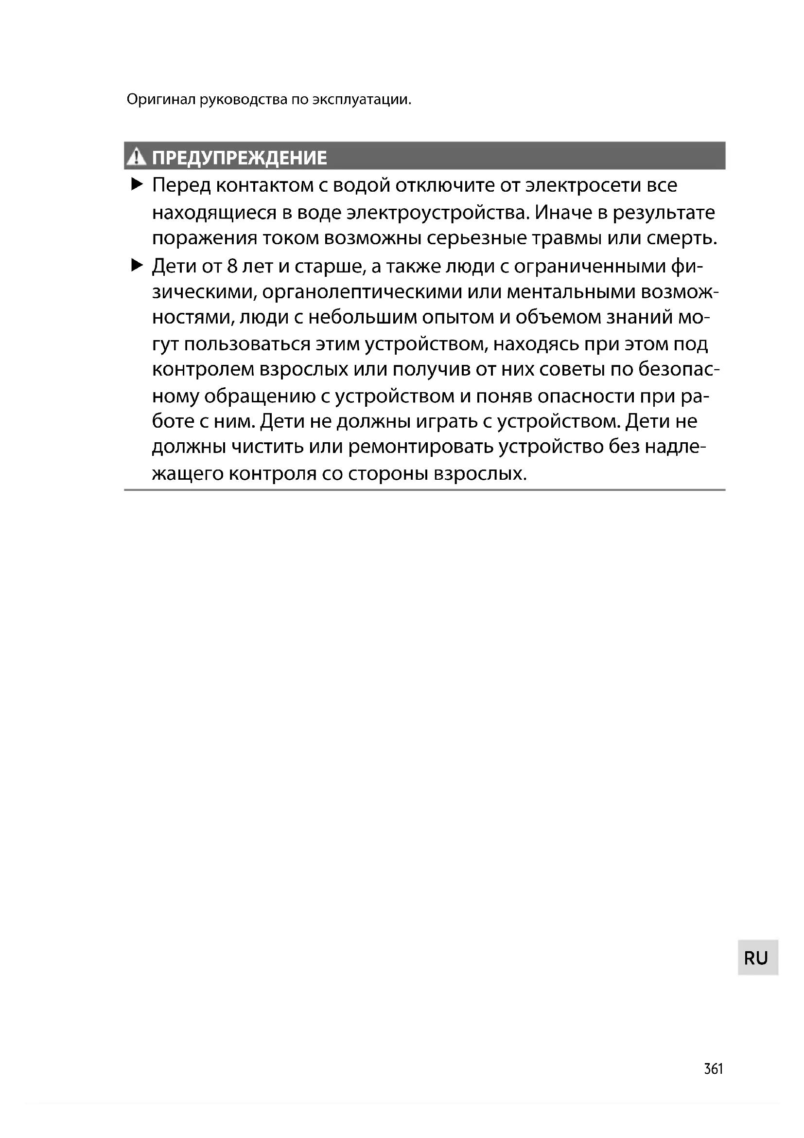 ПРЕДУП РЕ ЖДЕНИ Е ПРЕДУПРЕЖДЕНИЕ Перед контактом с водой отключите от электросети все находящиеся в воде электроустройства. Иначе в результате поражения током возможны серьезные травмы или смерть. Дети от 8 лет и старше, а также люди с ограниченными фи- зическими, органолептическими или ментальными возмож- ностями, люди с небольшим опытом и объемом знаний мо- гут пользоваться этим устройством, находясь при этом под контролем взрослых или получив от них советы по безопас- ному обращению с устройством и поняв опасности при ра- боте с ним. Дети не должны играть с устройством. Дети не должны чистить или ремонтировать устройство без надле- жащего контроля со стороны взрослых.362 Указания по технике безопасности Электрическое соединение