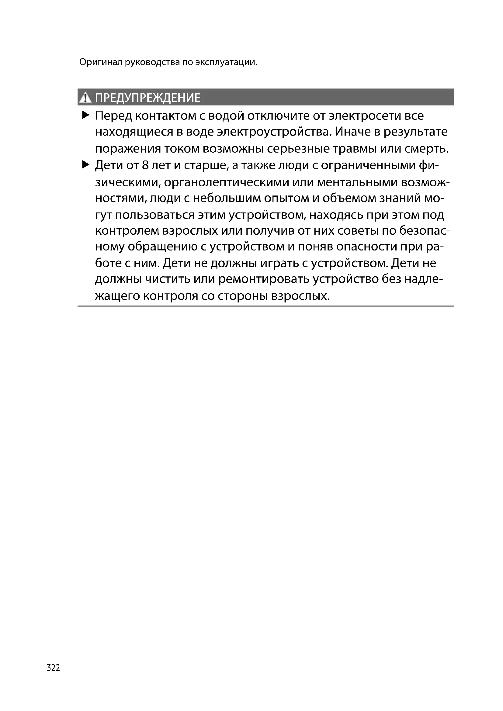 ПРЕДУП РЕ ЖДЕНИ Е ПРЕДУПРЕЖДЕНИЕ Перед контактом с водой отключите от электросети все находящиеся в воде электроустройства. Иначе в результате поражения током возможны серьезные травмы или смерть. Дети от 8 лет и старше, а также люди с ограниченными фи- зическими, органолептическими или ментальными возмож- ностями, люди с небольшим опытом и объемом знаний мо- гут пользоваться этим устройством, находясь при этом под контролем взрослых или получив от них советы по безопас- ному обращению с устройством и поняв опасности при ра- боте с ним. Дети не должны играть с устройством. Дети не должны чистить или ремонтировать устройство без надле- жащего контроля со стороны взрослых.RU