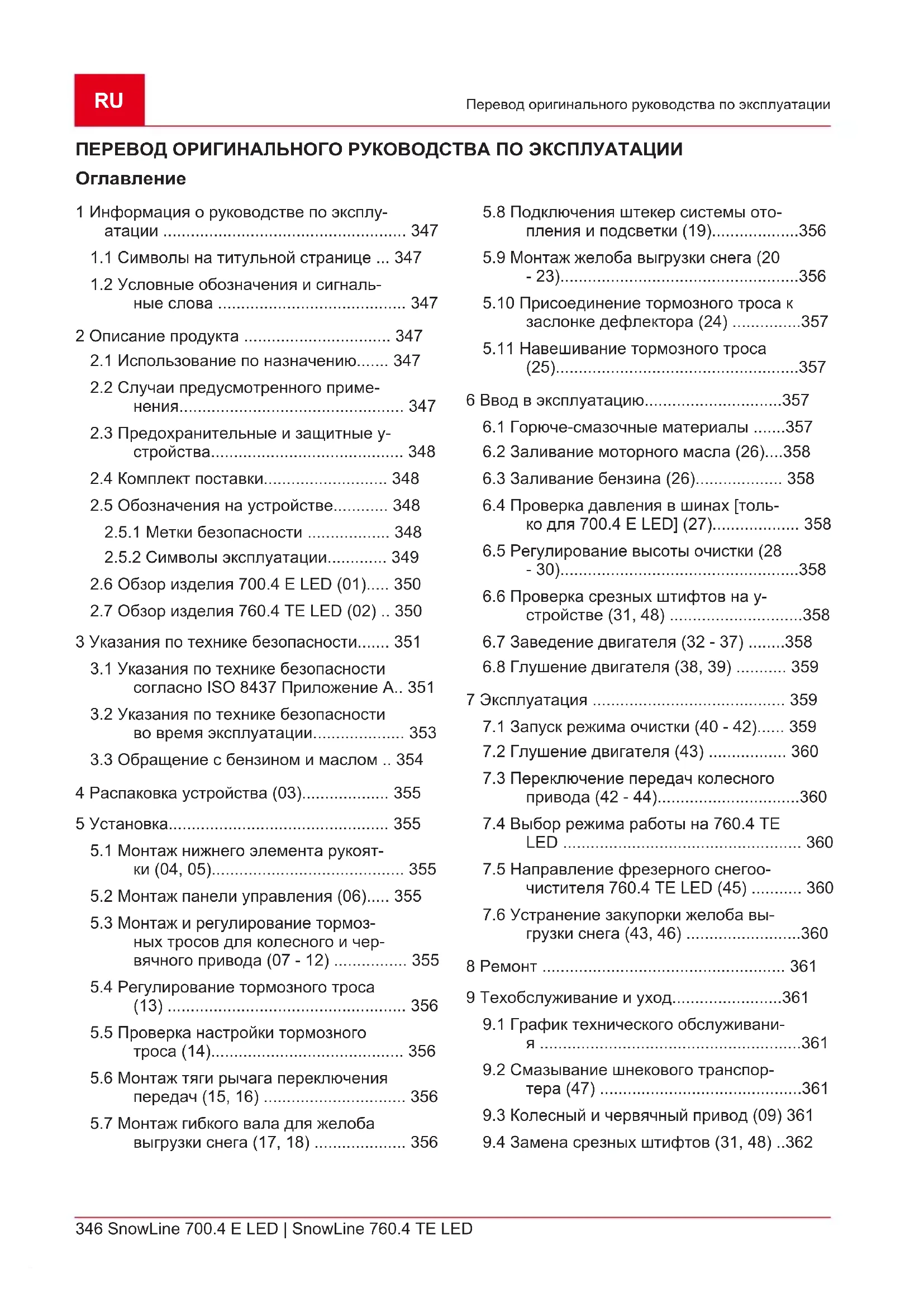 www.alko-garden.com/service-contacts Более подробная информация о запасных ча- стях доступна по ссылке: www.alko-garden.com/sparepartsRU 364 SnowLine 700.4 E LED | SnowLine 760.4 TE LED Информация о декларации соответствия 14 ИНФОРМАЦИЯ О ДЕКЛАРАЦИИ СООТВЕТСТВИЯ Настоящим заявляем с полной ответственно- стью, что данный продукт в реализуемой на рынке форме соответствует требованиям гар- монизированных Директив ЕС, стандартов безопасности ЕС и специальных стандартов, распространяющихся на данный продукт. Де- кларация соответствия является частью руко- водства по эксплуатации и прилагается к ма-