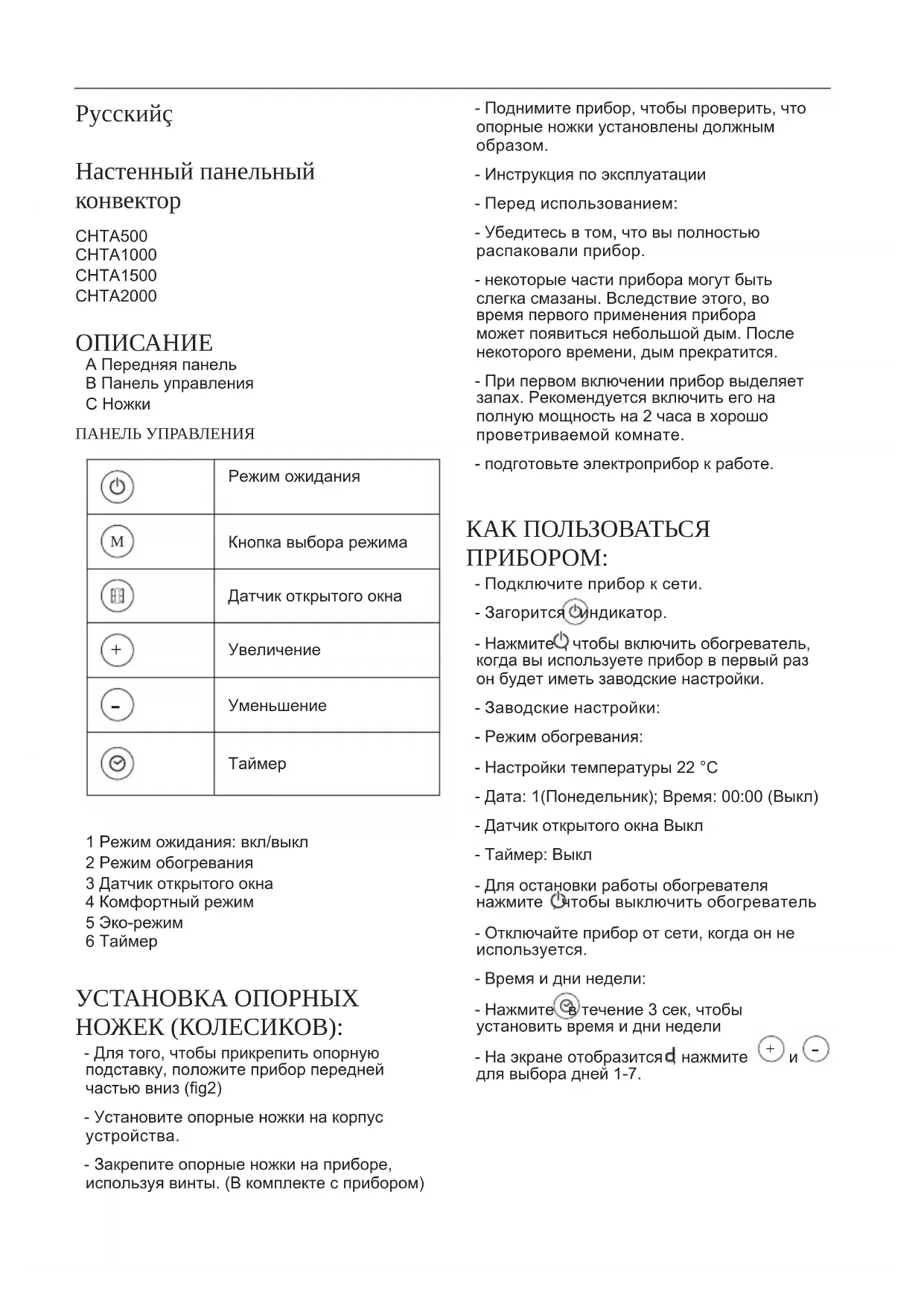 - Очистите прибор, используя влажную ткань и несколько капель чистящей жидкости, и вытрите его насухо. - Не допускается использовать растворители или продукты на основе кислоты или с высоким уровнем pH, например, отбеливатель, а также абразивные чистящие вещества. - Не допускайте попадания внутрь через отверстия для прохождения воздуха воды или иной жидкости, чтобы не повредить внутренние части. - Не помещайте электроприбор в воду или иную жидкость, а также под струю воды. - Если прибор не будет содержаться в чистом состоянии, его поверхность может быть повреждена, срок службы сокращен или даже его использование станет небезопасным. - Примечание: Когда прибор используется после того, как в течение длительного времени он находился в неупотреблении, может появиться небольшое количество дыма. Это не имеет особого значения и является следствием сжигания отложений пыли, которые накопились на обогревательных элементах. Этот эффект можно предотвратить, если предварительно очистить внутренние элементы прибора через решетку пылесосом или сжатым воздухом.Român Convector panou de perete CHTA500 CHTA1000 CHTA1500 CHTA2000 DESCRIERE A Panou frontal B Panou de control C Picior