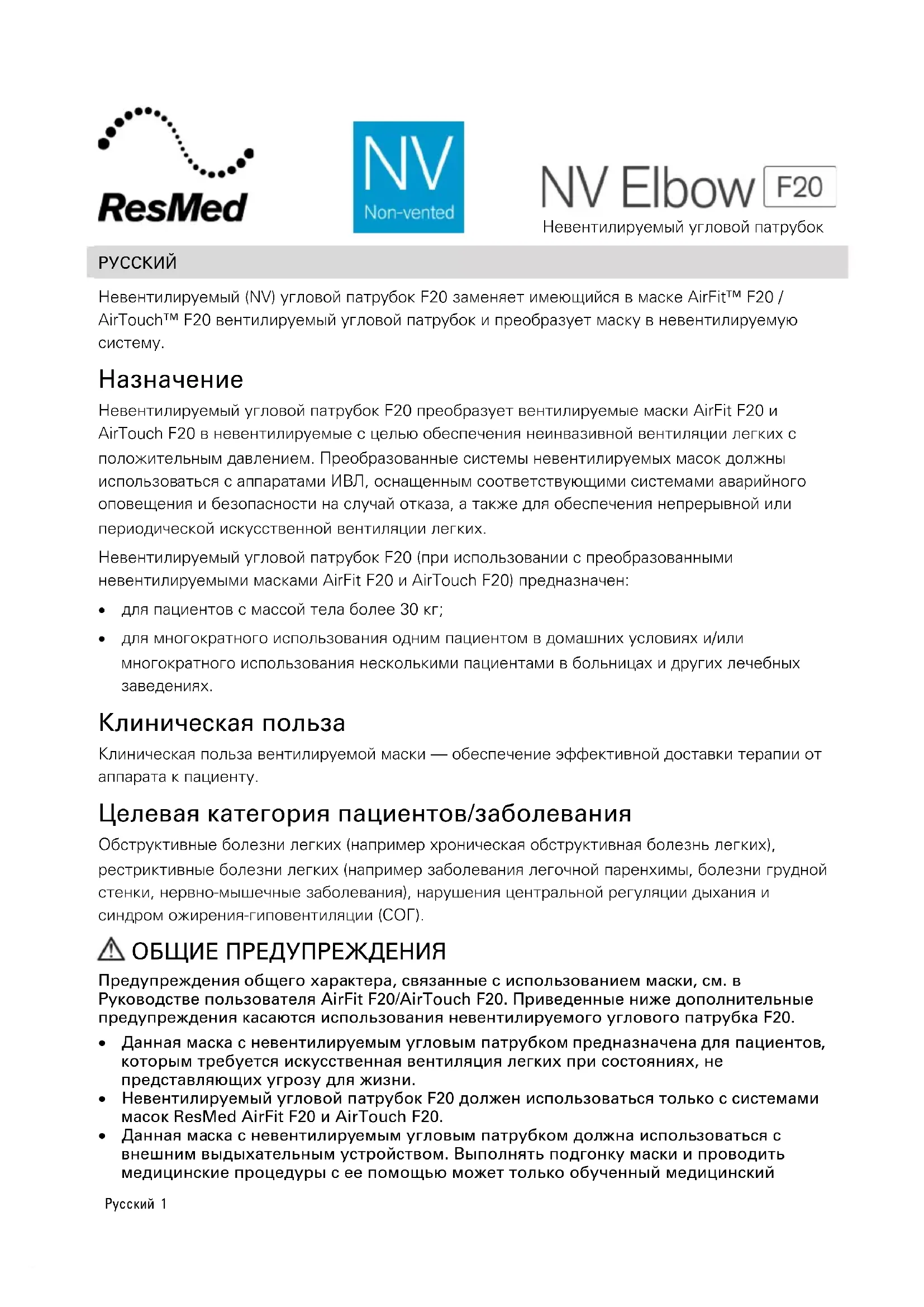 РУКОВОДСТВО ПОЛЬЗОВАТЕЛЯ NV Elbow F20 ResMed