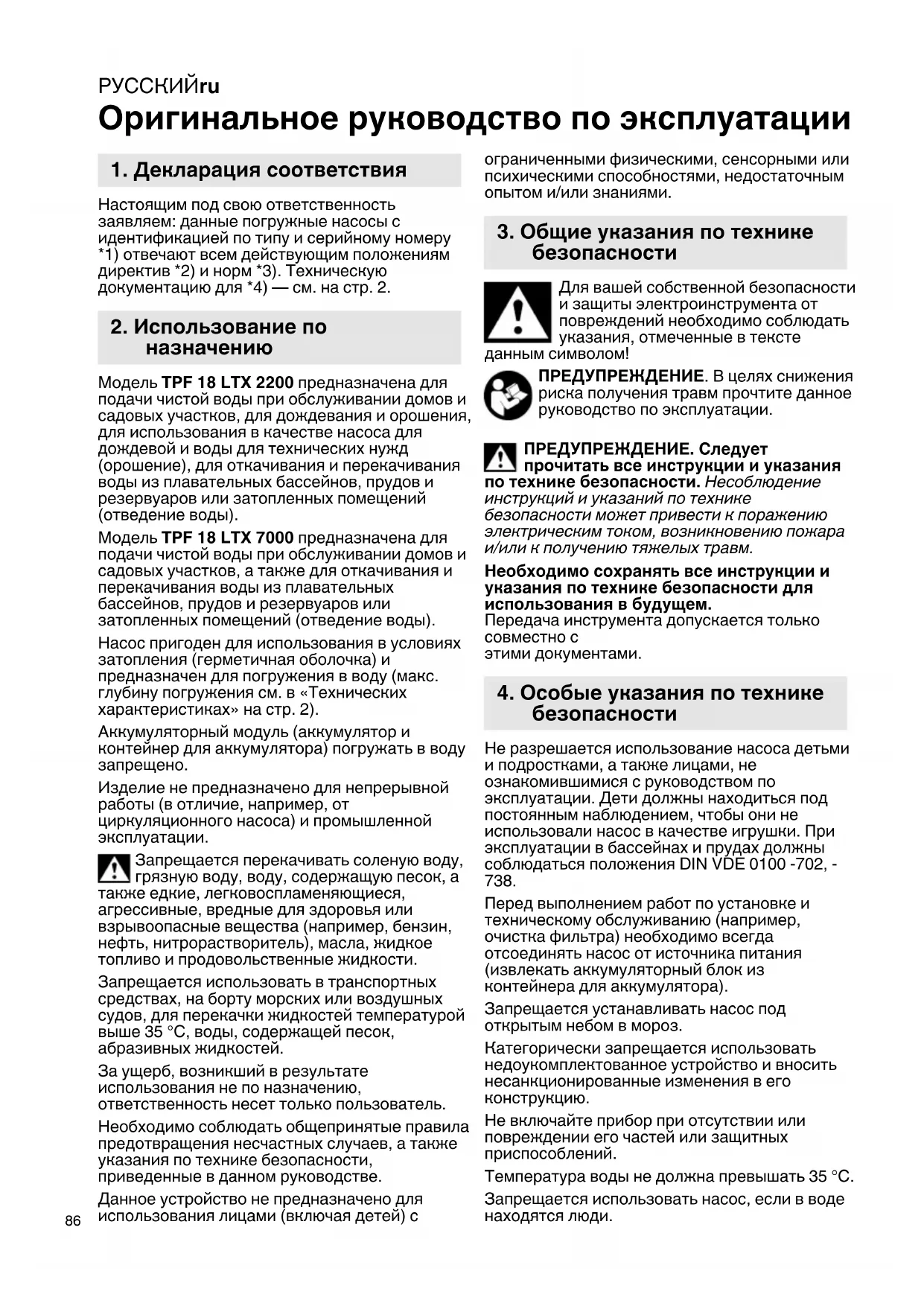 MoIeJIb TPF 18 LTX 7000 npEHa3HaueHa dJa IIOaun YnCTOu BObl pIn OBCJyKINBaHN DOMOB n CaIOBbIX yUacTkoB, a TaKKe dJa OTKaUNBaHnI nepeKaUnBaHN BObl n3 PIAbaTeJIbHbIX 6accEnHOB, npyDOn Ipe3epByapOB nI IN 3aTOIeHHbIX NOMEueHn (OTBeJeHne BObl).