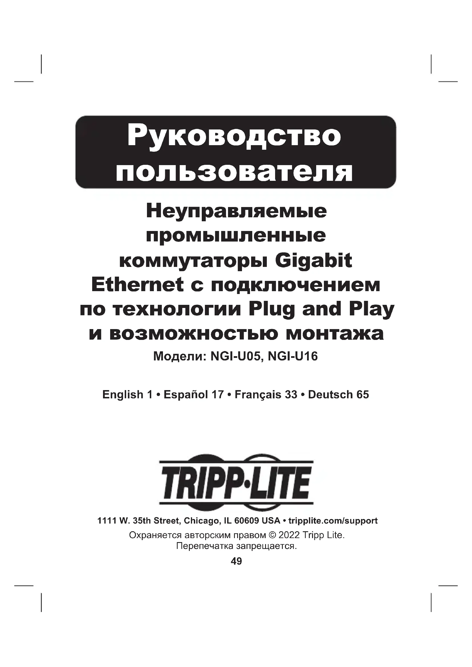 - Oтправку нового оборудования на переработку после окончательной выработки его pecypca Не рекомендуется использование данного оборудования в системах жизнеобеспечения, где его выход из строя предположительно может привести к перебоям в работе оборудования жизнеобеспечения или в значительной мере снизить его безопасность или эффективность. Компания Tripp Lite постоянно совершенствует свою продукцию. B связи с этим возможно изменение технических характеристик без предварительного уведомления. Внeшний вид реальных изделий может несколько отличаться от представленного на фотографиях и иллюстрацияx. 1111 W. 35th Street, Chicago, IL 60609 USA • tripplite.com/support 21-02-223 • 93-3E2B_RevA65 Nicht verwaltete, industrielle Gigabit- Ethernet-Switches, Plug-and-Play, montierbar Modelle: NGI-U05, NGI-U16 1111 W. 35th Street, Chicago, IL 60609 USA • tripplite.com/supportCopyright © 2022 Tripp Lite. Alle Rechte vorbehalten. Bedienungsanleitung English 1 • Español 17 • Français 33 • Русский 4966