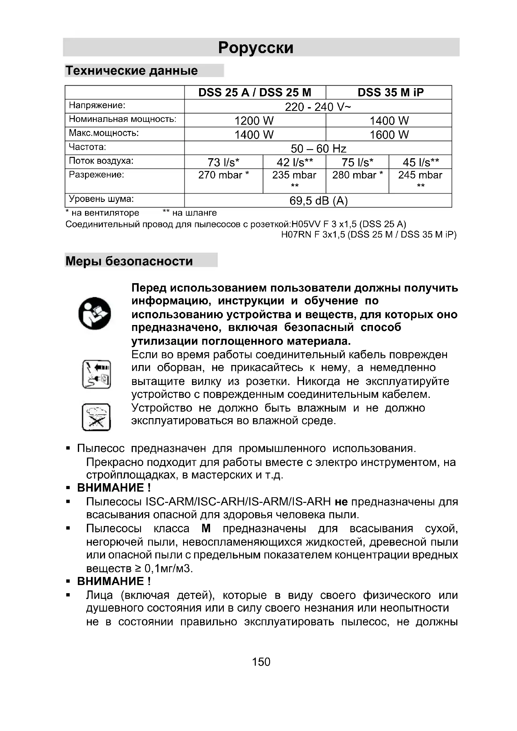 - на вентиляторе ** на шланге Соединительный провод для пылесосов с розеткой:H05VV F 3 x1,5 (DSS 25 A) H07RN F 3x1,5 (DSS 25 M / DSS 35 M iP) Меры безопасности
