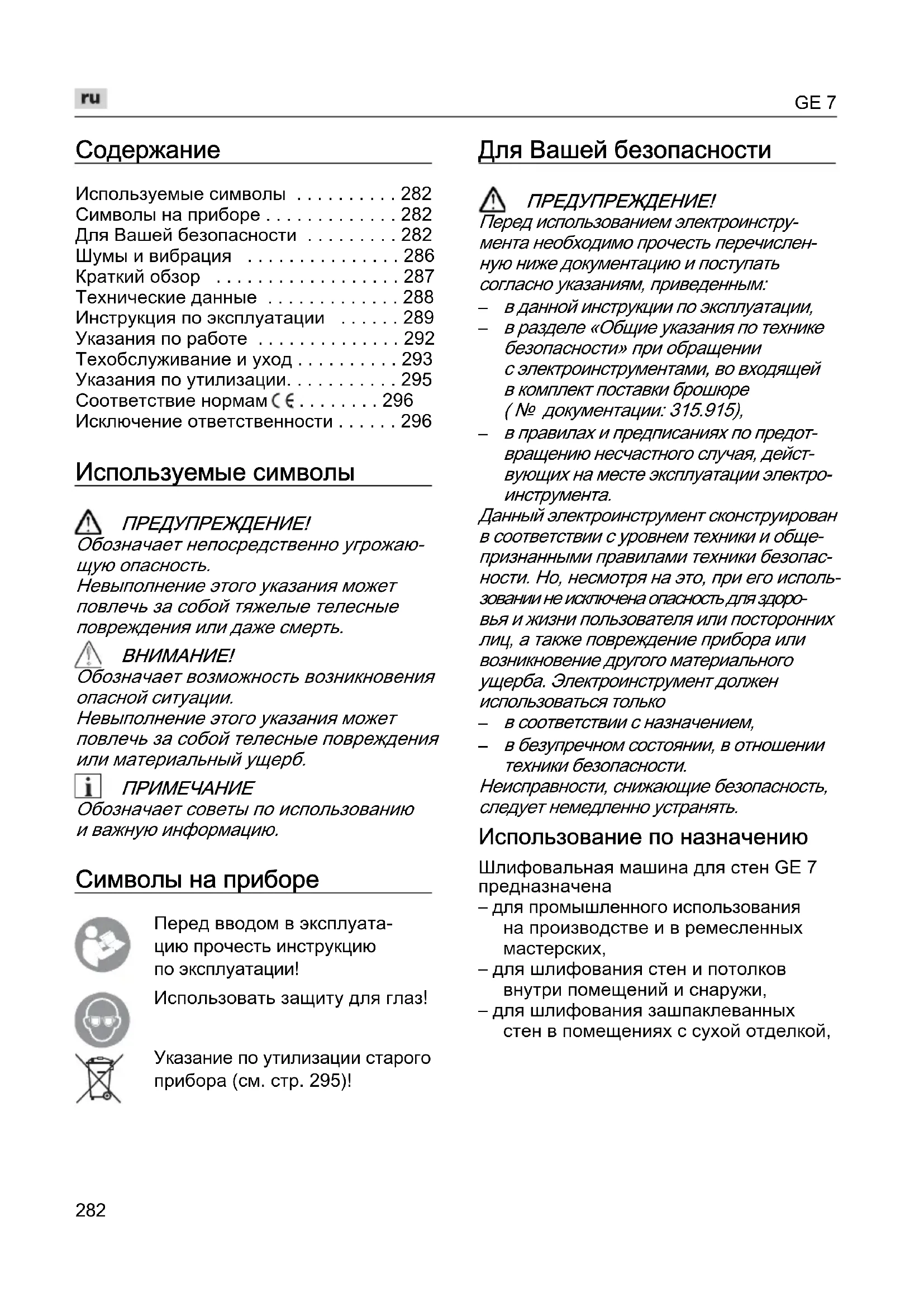 Обозначает советы по использованию и важную информацию. Символы на приборе Перед вводом в эксплуата- цию прочесть инструкцию по эксплуатации! Использовать защиту для глаз! Указание по утилизации старого прибора (см. стр. 295)! Для Вашей безопасности ПРЕДУПРЕЖДЕHИЕ! Перед использованием электроинстру- мента необходимо прочесть перечислен- ную ниже документацию и поступать согласно указаниям, приведенным: