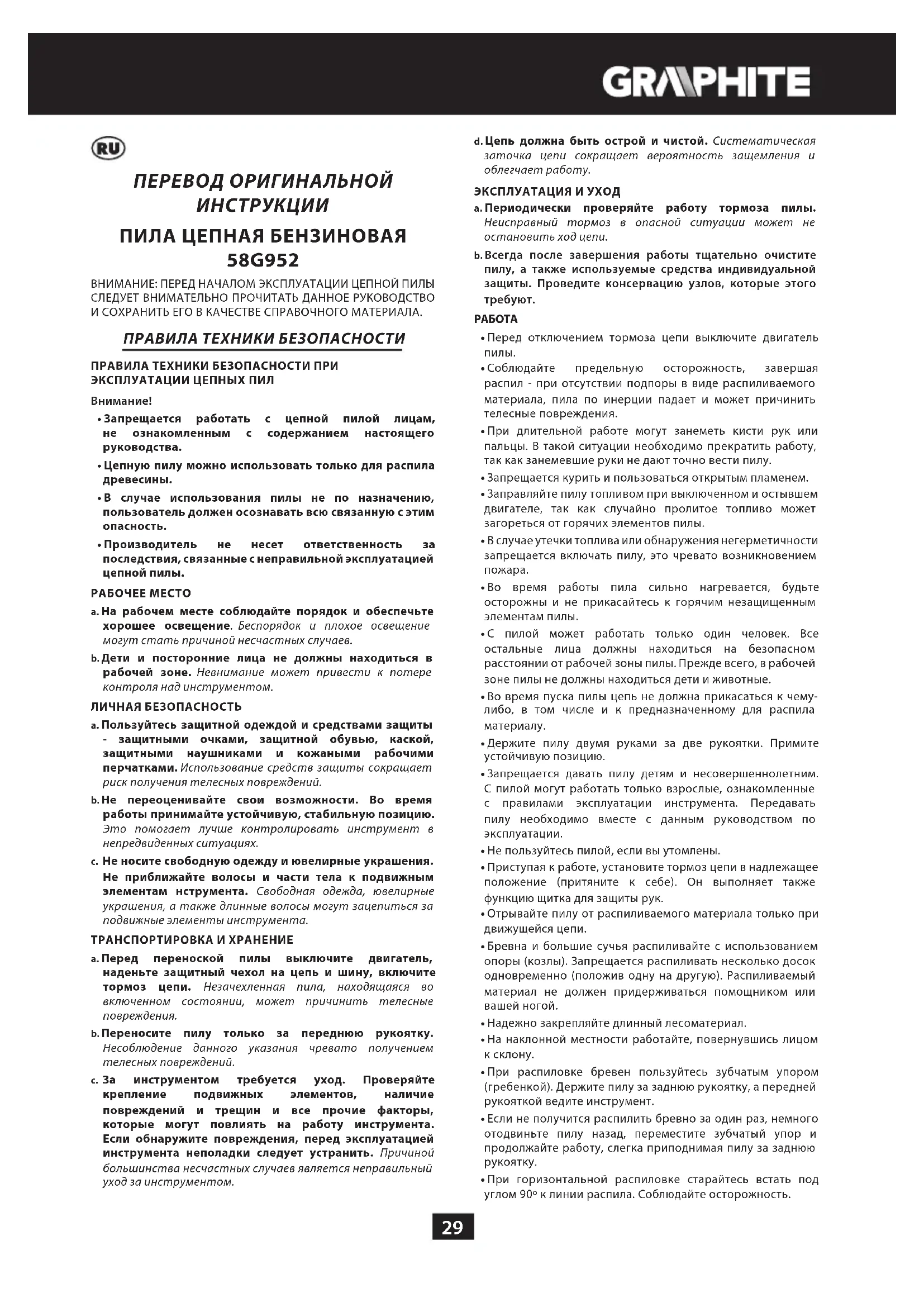 - Производитель не несет ответственность за последствия, связанные с неправильной эксплуатацией цепной пилы. РАБОЧЕЕ МЕСТО a. На рабочем месте соблюдайте порядок и обеспечьте хорошее освещение. Беспорядок и плохое освещение могут стать причиной несчастных случаев. b. Дети и посторонние лица не должны находиться в рабочей зоне. Невнимание может привести к потере контроля над инструментом. ЛИЧНАЯ БЕЗОПАСНОСТЬ a. Пользуйтесь защитной одеждой и средствами защиты - защитными очками, защитной обувью, каской, защитными наушниками и кожаными рабочими перчатками. Использование средств защиты сокращает риск получения телесных повреждений. b. Не переоценивайте свои возможности. Во время работы принимайте устойчивую, стабильную позицию. Это помогает лучше контролировать инструмент в непредвиденных ситуациях. c. Не носите свободную одежду и ювелирные украшения. Не приближайте волосы и части тела к подвижным элементам нструмента. Свободная одежда, ювелирные украшения, а также длинные волосы могут зацепиться за подвижные элементы инструмента. ТРАНСПОРТИРОВКА И ХРАНЕНИЕ a. Перед переноской пилы выключите двигатель, наденьте защитный чехол на цепь и шину, включите тормоз цепи. Незачехленная пила, находящаяся во включенном состоянии, может причинить телесные повреждения. b. Переносите пилу только за переднюю рукоятку. Несоблюдение данного указания чревато получением телесных повреждений. c. За инструментом требуется уход. Проверяйте крепление подвижных элементов, наличие повреждений и трещин и все прочие факторы, которые могут повлиять на работу инструмента. Если обнаружите повреждения, перед эксплуатацией инструмента неполадки следует устранить. Причиной большинства несчастных случаев является неправильный уход за инструментом.30