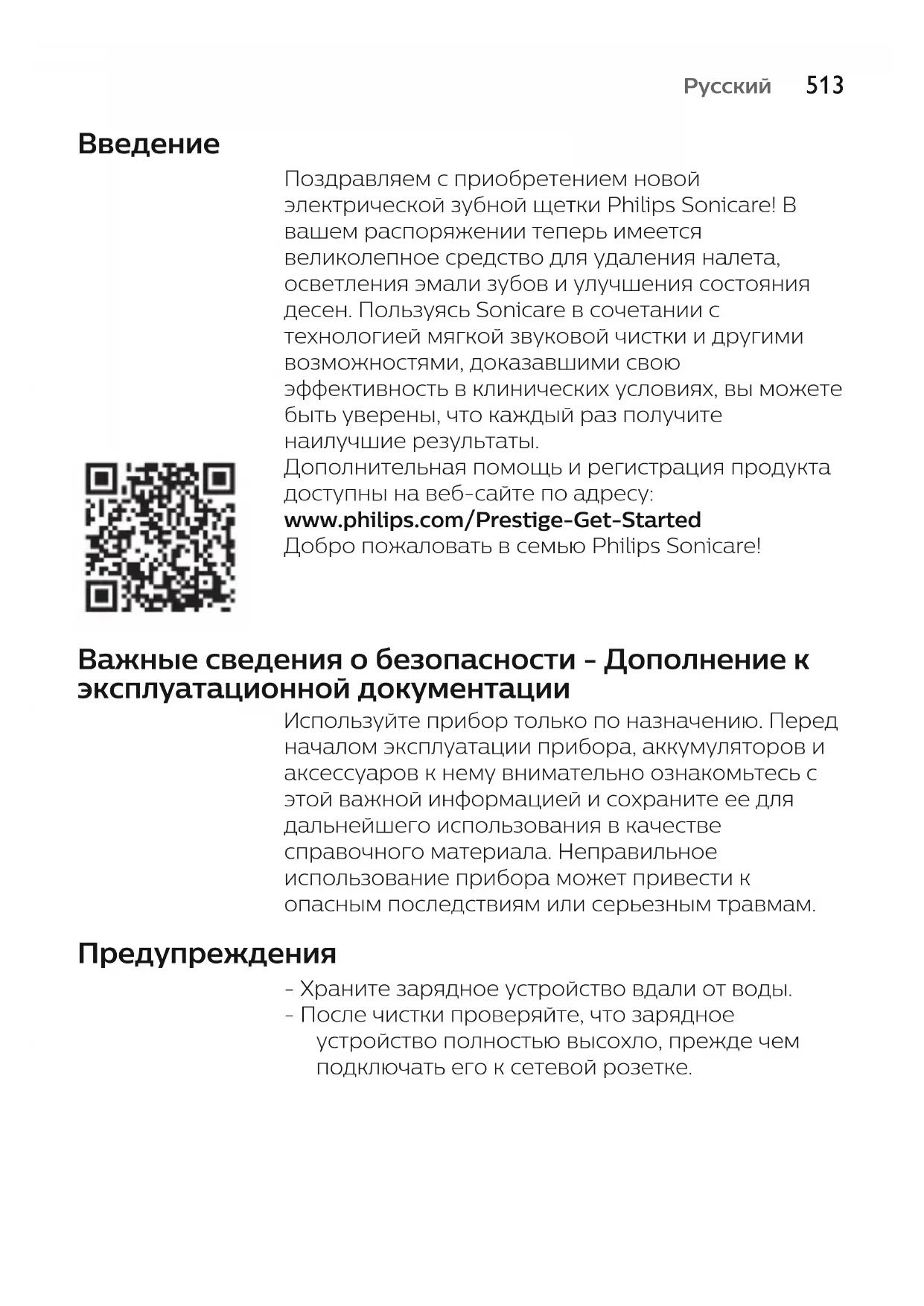 Поздравляем с приобретением новой электрической зубной щетки Philips Sonicare! В вашем распоряжении теперь имеется великолепное средство для удаления налета, осветления эмали зубов и улучшения состояния десен. Пользуясь Sonicare в сочетании с технологией мягкой звуковой чистки и другими возможностями, доказавшими свою эффективность в клинических условиях, вы можете быть уверены, что каждый раз получите наилучшие результаты. Дополнительная помощь и регистрация продукта доступны на веб-сайте по адресу: www.philips.com/Prestige-Get-Started Добро пожаловать в семью Philips Sonicare! Важные сведения о безопасности - Дополнение к эксплуатационной документации Используйте прибор только по назначению. Перед началом эксплуатации прибора, аккумуляторов и аксессуаров к нему внимательно ознакомьтесь с этой важной информацией и сохраните ее для дальнейшего использования в качестве справочного материала. Неправильное использование прибора может привести к опасным последствиям или серьезным травмам. Предупреждения - Храните зарядное устройство вдали от воды. - После чистки проверяйте, что зарядное устройство полностью высохло, прежде чем подключать его к сетевой розетке.514