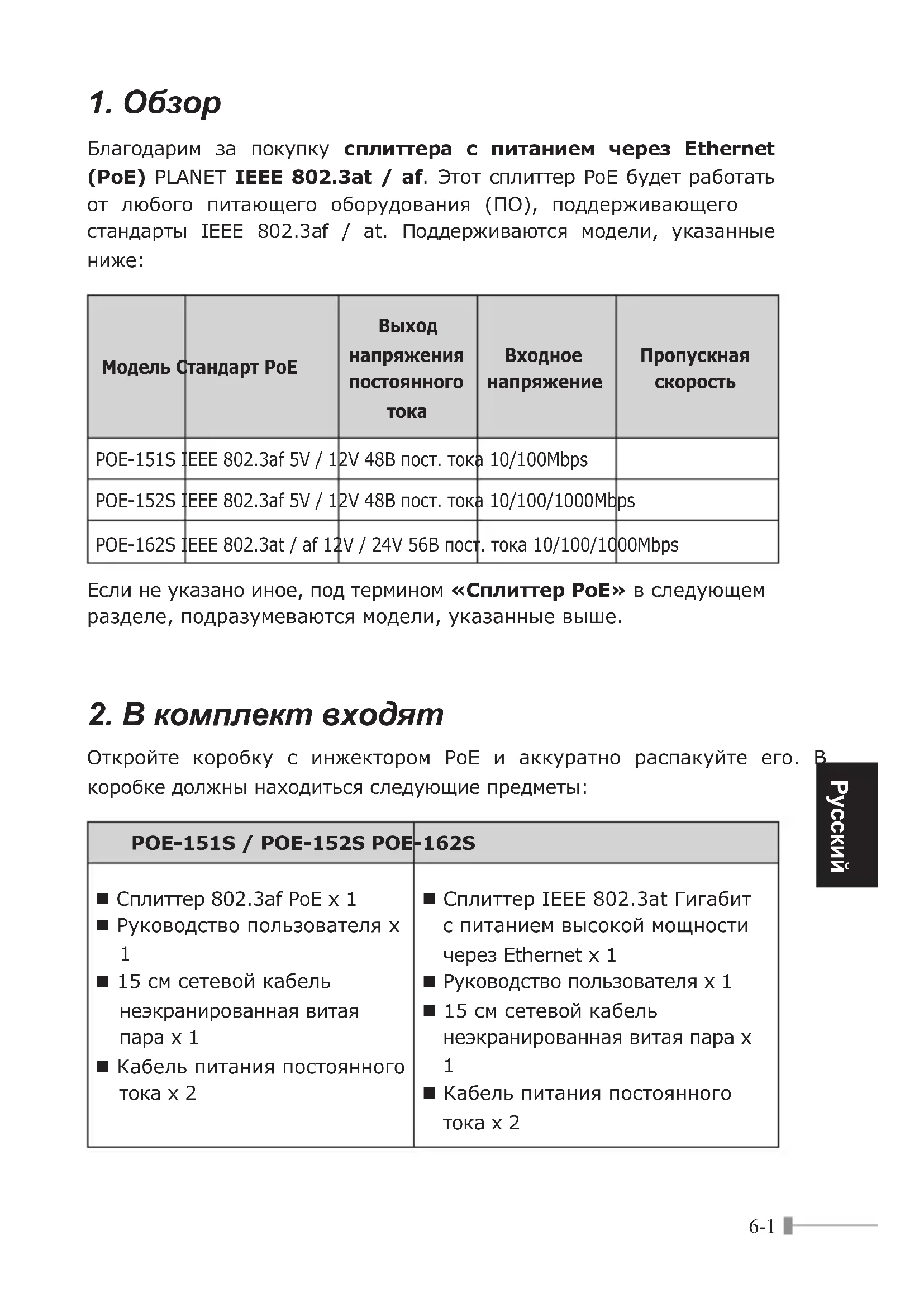 POE-151S IEEE 802.3af 5V / 12V 48В пост. тока 10/100Mbps POE-152S IEEE 802.3af 5V / 12V 48В пост. тока 10/100/1000Mbps POE-162S IEEE 802.3at / af 12V / 24V 56В пост. тока 10/100/1000Mbps Если не указано иное, под термином «Сплиттер PoE» в следующем разделе, подразумеваются модели, указанные выше.