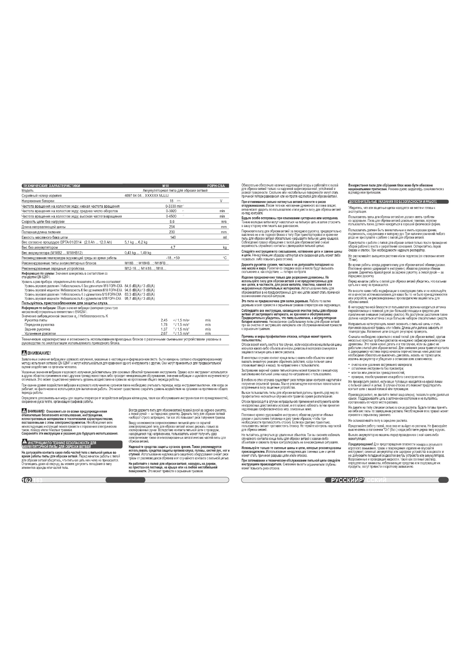 Серийный номер изделия Напряжение батареи Частота вращения на холостом ходу, низкая частота вращения Частота вращения на холостом ходу, среднее число оборотов Частота вращения на холостом ходу, высокая частота вращения Скорость цепи без нагрузки Длина направляющей шины Полезная длина пиления Емкость масляного бака цепи Вес согласно процедуре EPTA 01/2014 (2.0 Ah ... 12.0 Ah) Вес без аккумулятором Вес аккумулятора (M18B2 ... M18HB12) Рекомендованная температура окружающей среды во время работы Рекомендованные типы аккумуляторных блоков Рекомендованные зарядные устройства Информация по шумам: Значения замерялись в соответствии со стандартом EN 62841. Уровень шума прибора, определенный по показателю А, обычно составляет: Уровень звукового давления / Небезопасность K без удлинителя M18 FOPH-EXA Уровень звуковой мощности / Небезопасность K без удлинителя M18 FOPH-EXA Уровень звукового давления / Небезопасность K с удлинителем M18 FOPH-EXA Уровень звуковой мощности / Небезопасность K с удлинителем M18 FOPH-EXA Пользуйтесь приспособлениями для защиты слуха. Информация по вибрации: Общие значения вибрации (векторная сумма трех направлений) определены в соответствии с EN 62841. Значение вибрационной эмиссии a