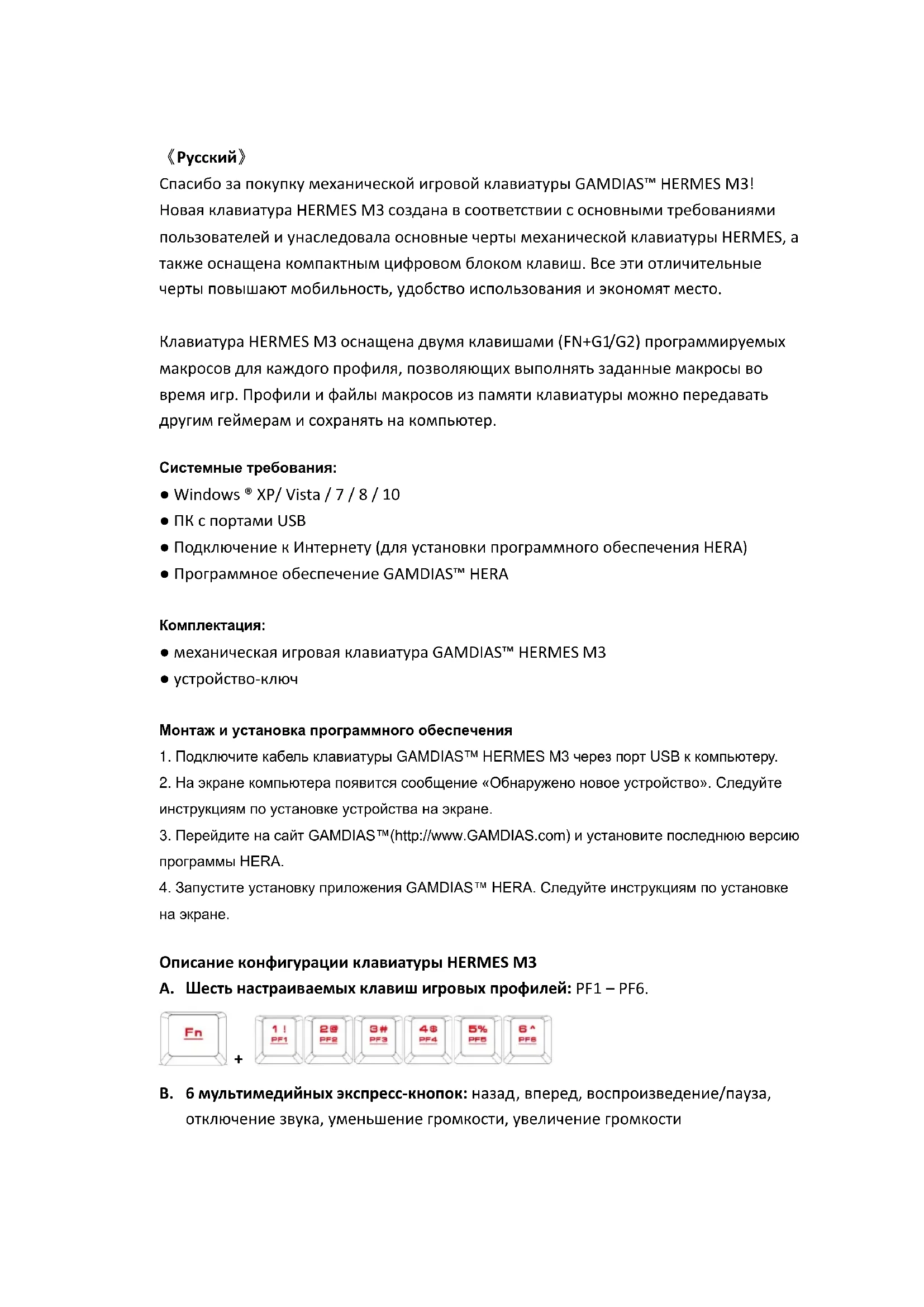 Спасибо за покупку механической игровой клавиатуры GAMDIAS™ HERMES M3! Новая клавиатура HERMES M3 создана в соответствии с основными требованиями пользователей и унаследовала основные черты механической клавиатуры HERMES, а также оснащена компактным цифровом блоком клавиш. Все эти отличительные черты повышают мобильность, удобство использования и экономят место. Клавиатура HERMES M3 оснащена двумя клавишами (FN+G1/G2) программируемых макросов для каждого профиля, позволяющих выполнять заданные макросы во время игр. Профили и файлы макросов из памяти клавиатуры можно передавать другим геймерам и сохранять на компьютер. Системные требования: ● Windows ® XP/ Vista / 7 / 8 / 10 ● ПК с портами USB ● Подключение к Интернету (для установки программного обеспечения HERA) ● Программное обеспечение GAMDIAS™ HERA Комплектация: ● механическая игровая клавиатура GAMDIAS™ HERMES M3 ● устройство-ключ Монтаж и установка программного обеспечения