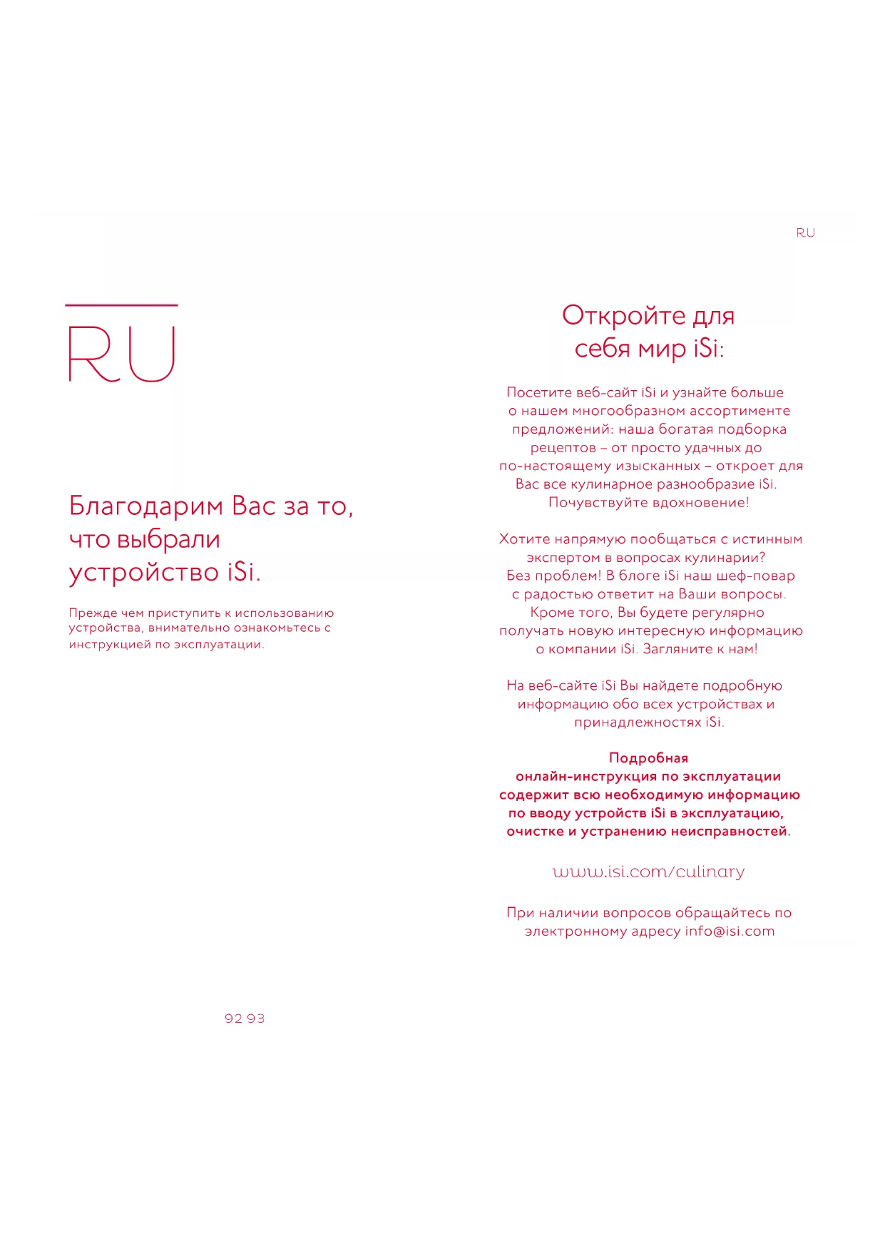 онлайн-инструкция по эксплуатации содержит всю необходимую информацию по вводу устройств iSi в эксплуатацию, очистке и устранению неисправностей. www.isi.com/culinary При наличии вопросов обращайтесь по электронному адресу info@isi.com