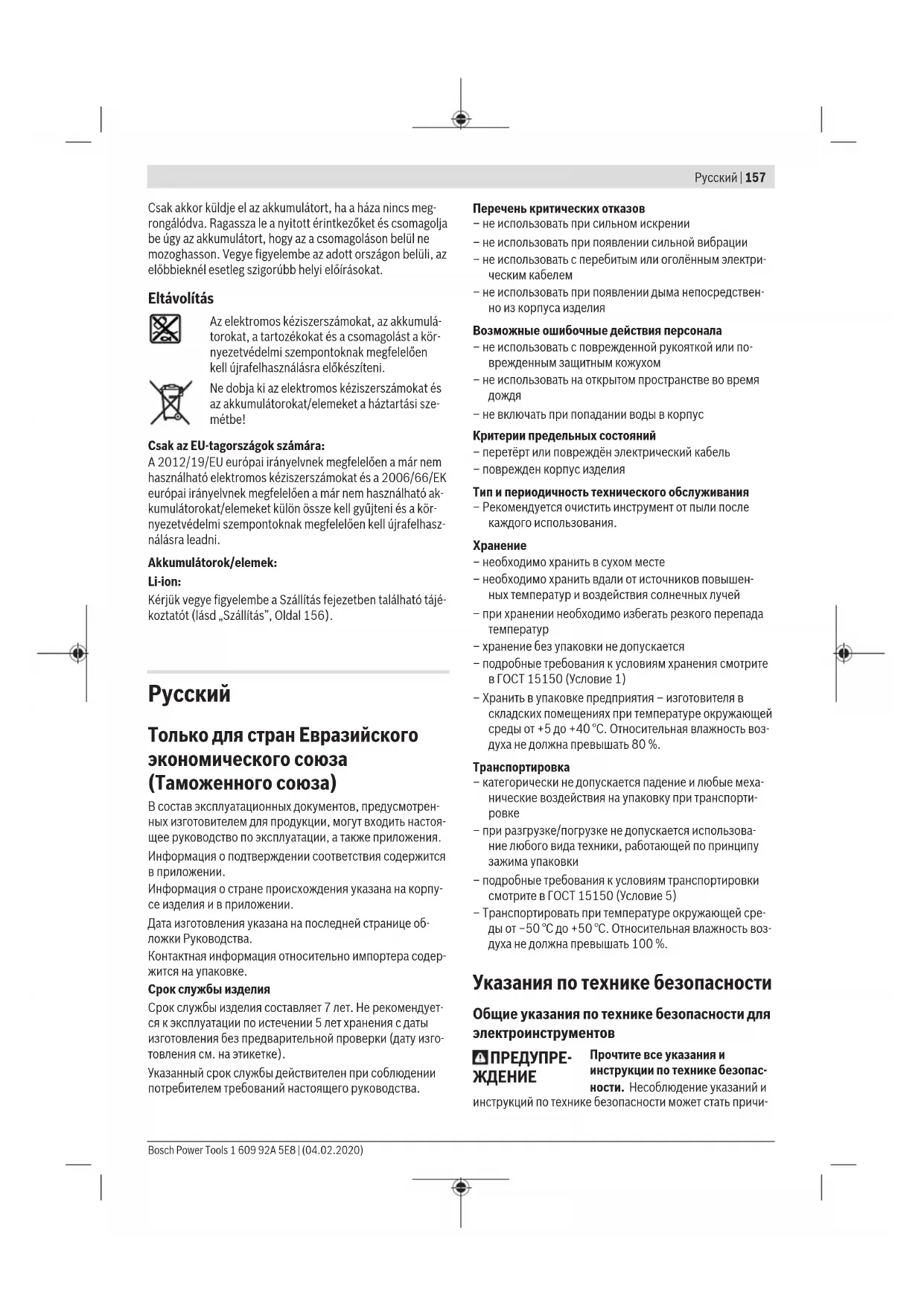 ТОО «Роберт Бош» (Robert Bosch) Power Tools послепродажное обслуживание ул. Муратбаева, д. 180 050012 Алматы, Казахстан Служебная эл. почта: service.pt.ka@bosch.com Официальный веб-сайт: www.bosch.com, www.bosch-pt.com В случае выхода электроинструмента из строя в течение гарантийного срока эксплуатации по вине изготовителя, владелец имеет право на бесплатный гарантийный ре- монт, при соблюдении следующих условий: – отсутствие механических повреждений; – отсутствие признаков нарушения требований руко- водства по эксплуатации – наличие в руководстве по эксплуатации отметки про- давца о продаже и подписи покупателя; – соответствие серийного номера электроинструмента и серийному номеру в гарантийном талоне; – отсутствие следов неквалифицированного ремонта. Гарантия не распространяется на: – любые поломки, связанные с форс-мажорными обсто- ятельствами; – нормальный износ: электроинструмента, так же, как и все электрические. Гарантией не покрывается ремонт, потребность в кото- ром возникает вследствие нормального износа, сокра- щающего срок службы таких частей инструмента, как присоединительные контакты, провода, щётки и т.п.: – естественный износ (полная выработка ресурса); – оборудование и его части, выход из строя которых стал следствием неправильной установки, несанкцио- нированной модификации, неправильного примене- ния, нарушение правил обслуживания или хранения; – неисправности, возникшие в результате перегрузки электроинструмента. (К безусловным признакам пере- грузки инструмента относятся: появление цвета побе- жалости, деформация или оплавление деталей и узлов электроинструмента, потемнение или обугливание изоляции проводов электродвигателя под действием высокой температуры.) Транспортировка На вложенные литиево-ионные аккумуляторные батареи распространяются требования в отношении транспорти- ровки опасных грузов. Аккумуляторные батареи могут перевозиться самим пользователем автомобильным транспортом без необходимости соблюдения дополни- тельных норм. При перевозке с привлечением третьих лиц (напр.: само- летом или транспортным экспедитором) необходимо соблюдать особые требования к упаковке и маркировке. В этом случае при подготовке груза к отправке необходи- мо участие эксперта по опасным грузам. Отправляйте аккумуляторную батарею только с неповре- жденным корпусом. Заклейте открытые контакты и упа- куйте аккумуляторную батарею так, чтобы она не переме- щалась внутри упаковки. Пожалуйста, соблюдайте также возможные дополнительные национальные предписа-