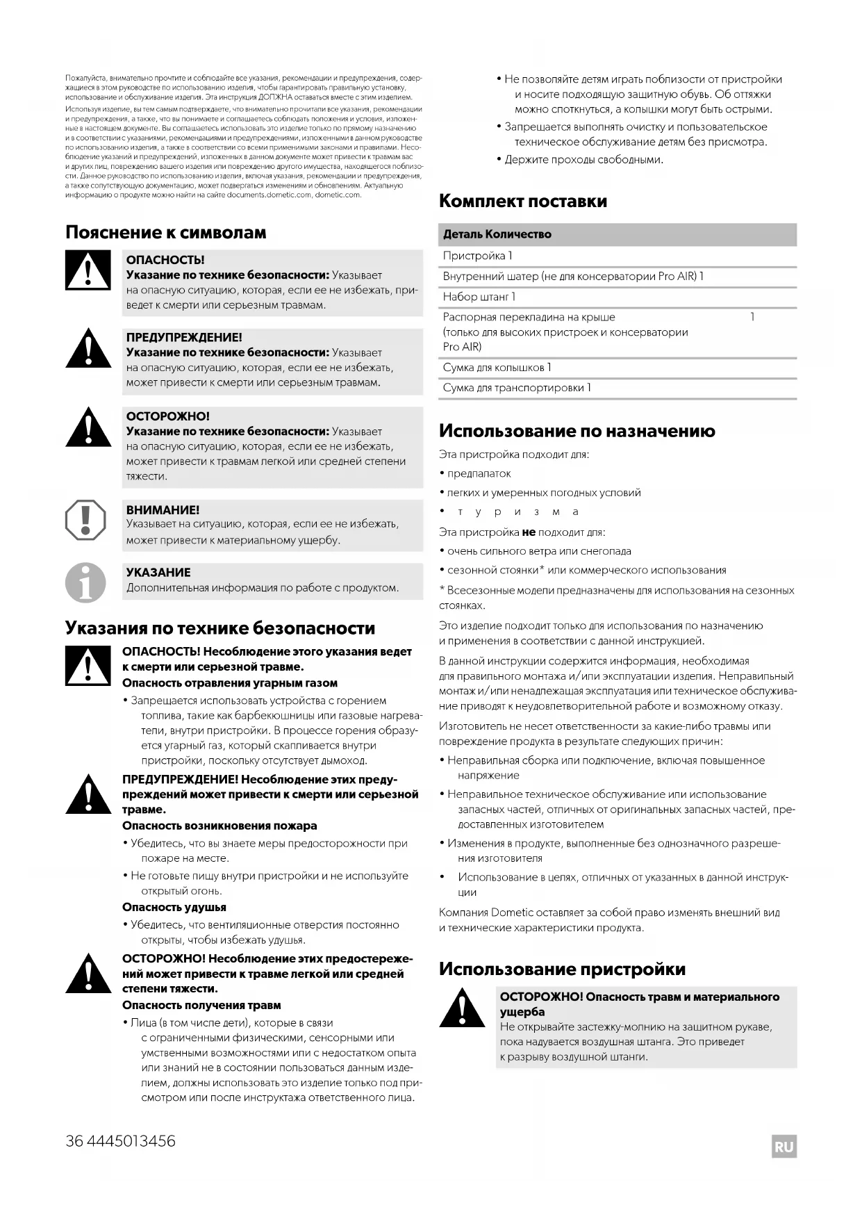 Пожалуйста, внимательно прочтите и соблюдайте все указания, рекомендации и предупреждения, содер- жащиеся в этом руководстве по использованию изделия, чтобы гарантировать правильную установку, использование и обслуживание изделия. Эта инструкция ДОЛЖНА оставаться вместе с этим изделием. Используя изделие, вы тем самым подтверждаете, что внимательно прочитали все указания, рекомендации и предупреждения, а также, что вы понимаете и соглашаетесь соблюдать положения и условия, изложен- ные в настоящем документе. Вы соглашаетесь использовать это изделие только по прямому назначению и в соответствии с указаниями, рекомендациями и предупреждениями, изложенными в данном руководстве по использованию изделия, а также в соответствии со всеми применимыми законами и правилами. Несо- блюдение указаний и предупреждений, изложенных в данном документе может привести к травмам вас и других лиц, повреждению вашего изделия или повреждению другого имущества, находящегося поблизо- сти. Данное руководство по использованию изделия, включая указания, рекомендации и предупреждения, а также сопутствующую документацию, может подвергаться изменениям и обновлениям. Актуальную информацию о продукте можно найти на сайте documents.dometic.com, dometic.com. Пояснение к символам