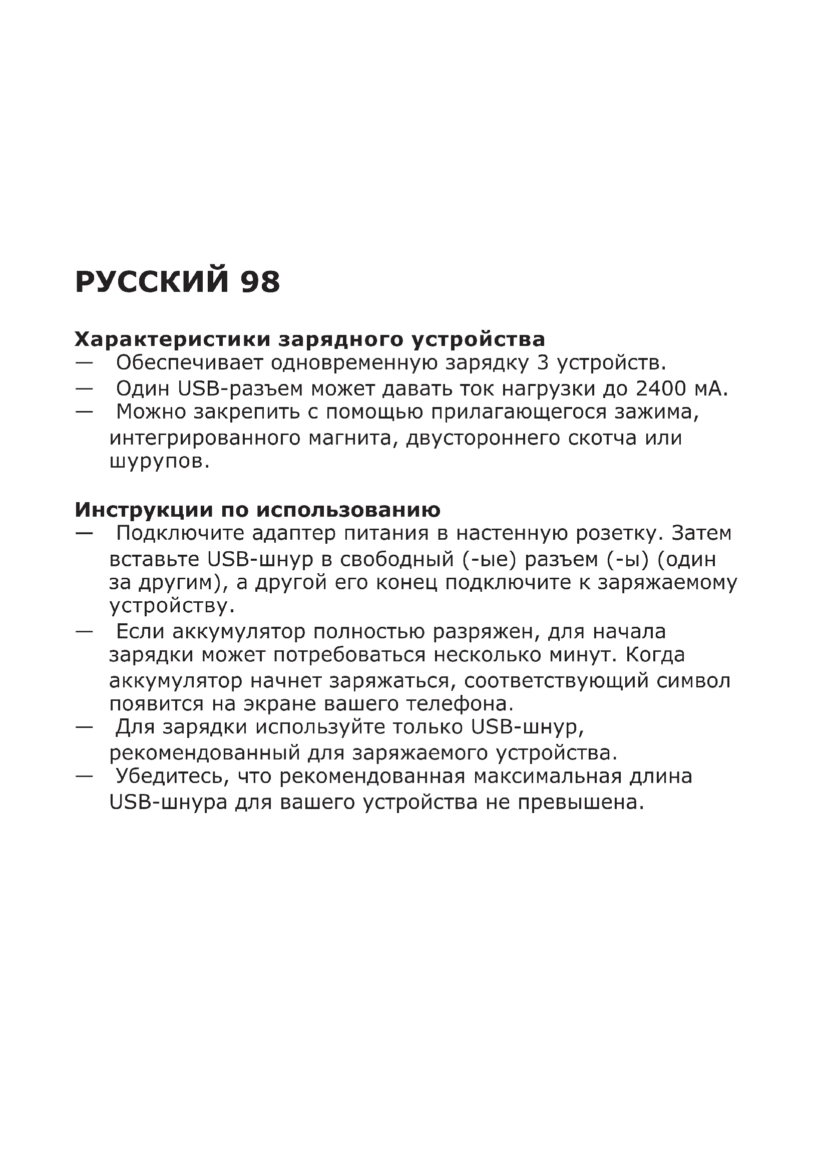 Инструкции по использованию — Подключите адаптер питания в настенную розетку. Затем вставьте USB-шнур в свободный (-ые) разъем (-ы) (один за другим), а другой его конец подключите к заряжаемому устройству. — Если аккумулятор полностью разряжен, для начала зарядки может потребоваться несколько минут. Когда аккумулятор начнет заряжаться, соответствующий символ появится на экране вашего телефона. — Для зарядки используйте только USB-шнур, рекомендованный для заряжаемого устройства. — Убедитесь, что рекомендованная максимальная длина USB-шнура для вашего устройства не превышена.99 Полезная информация — Длина и качество USB-шнура влияют на скорость и эффективность зарядки. — В процессе зарядки устройства могут нагреваться. Это нормально. По окончании зарядки они постепенно остынут до нормальной температуры. — Время зарядки может варьироваться в зависимости от емкости аккумулятора, уровня заряда, продолжительности использования аккумулятора и температуры окружающей среды. — Температура хранения зарядного устройства: от -20 °C до 25 °C. — Рабочая температура: от 0 °C до 40 °C. Перед обслуживанием, а также на периоды неиспользования отключайте устройство от сети. Протирайте устройство влажной тканью. Никогда не погружайте устройство в воду. Рекомендуемые меры предосторожности и техническую информацию см. на обороте зарядного устройства. Сохраните эти инструкции для справок в дальнейшем.100