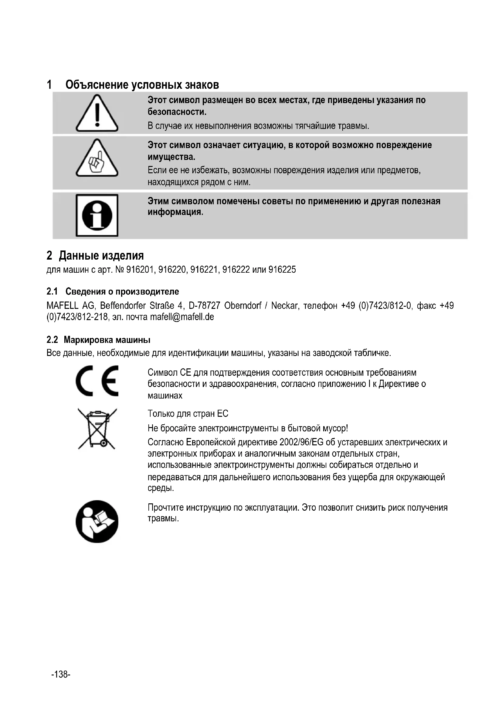 Этим символом помечены советы по применению и другая полезная информация. 2 Данные изделия для машин с арт. № 916201, 916220, 916221, 916222 или 916225