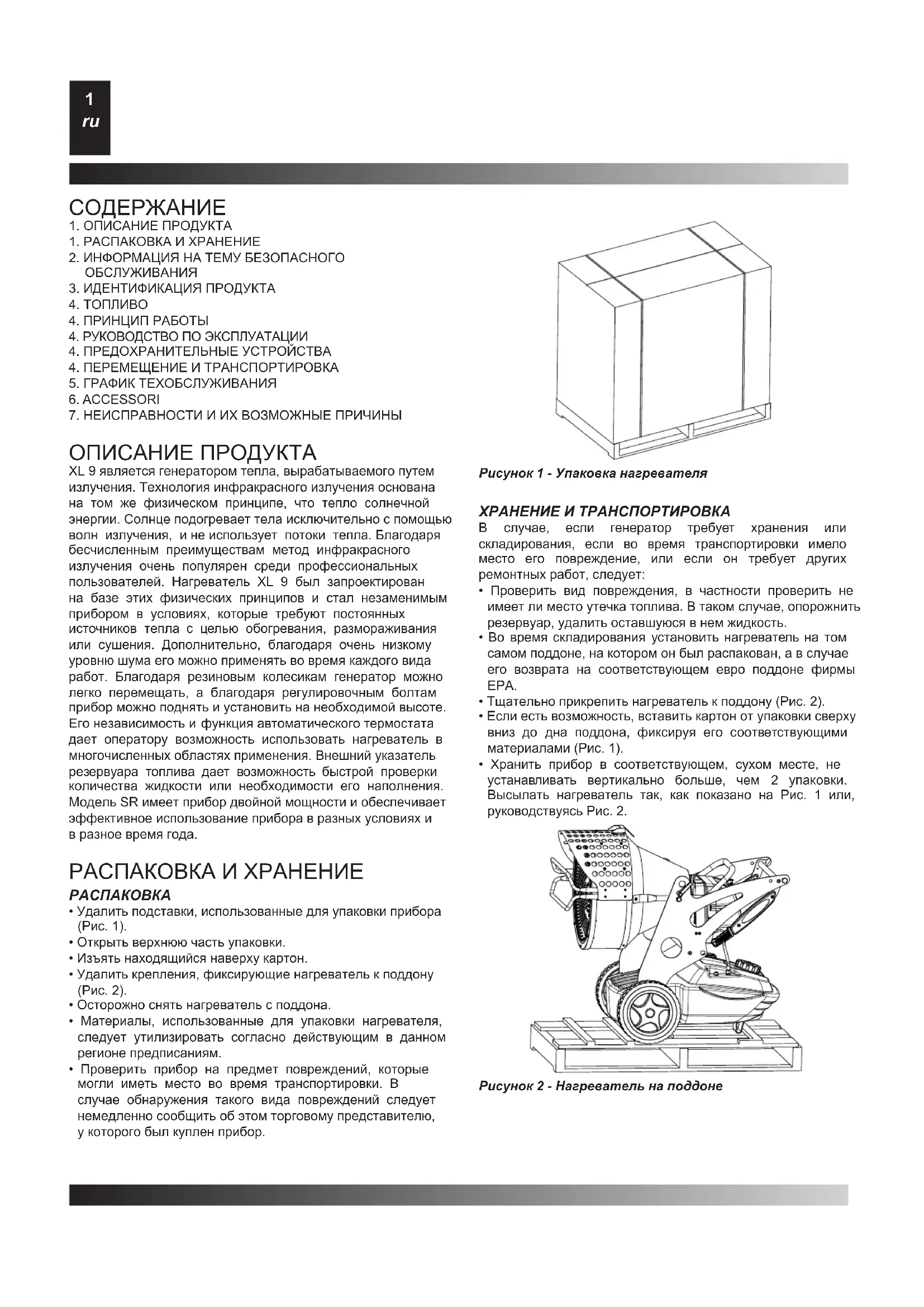 ОПИСАНИЕ ПРОДУКТА XL 9 является генератором тепла, вырабатываемого путем излучения. Технология инфракрасного излучения основана на том же физическом принципе, что тепло солнечной энергии. Солнце подогревает тела исключительно с помощью волн излучения, и не использует потоки тепла. Благодаря бесчисленным преимуществам метод инфракрасного излучения очень популярен среди профессиональных пользователей. Нагреватель XL 9 был запроектирован на базе этих физических принципов и стал незаменимым прибором в условиях, которые требуют постоянных источников тепла с целью обогревания, размораживания или сушения. Дополнительно, благодаря очень низкому уровню шума его можно применять во время каждого вида работ. Благодаря резиновым колесикам генератор можно легко перемещать, а благодаря регулировочным болтам прибор можно поднять и установить на необходимой высоте. Его независимость и функция автоматического термостата дает оператору возможность использовать нагреватель в многочисленных областях применения. Внешний указатель резервуара топлива дает возможность быстрой проверки количества жидкости или необходимости его наполнения. Модель SR имеет прибор двойной мощности и обеспечивает эффективное использование прибора в разных условиях и в разное время года. РАСПАКОВКА И ХРАНЕНИЕ