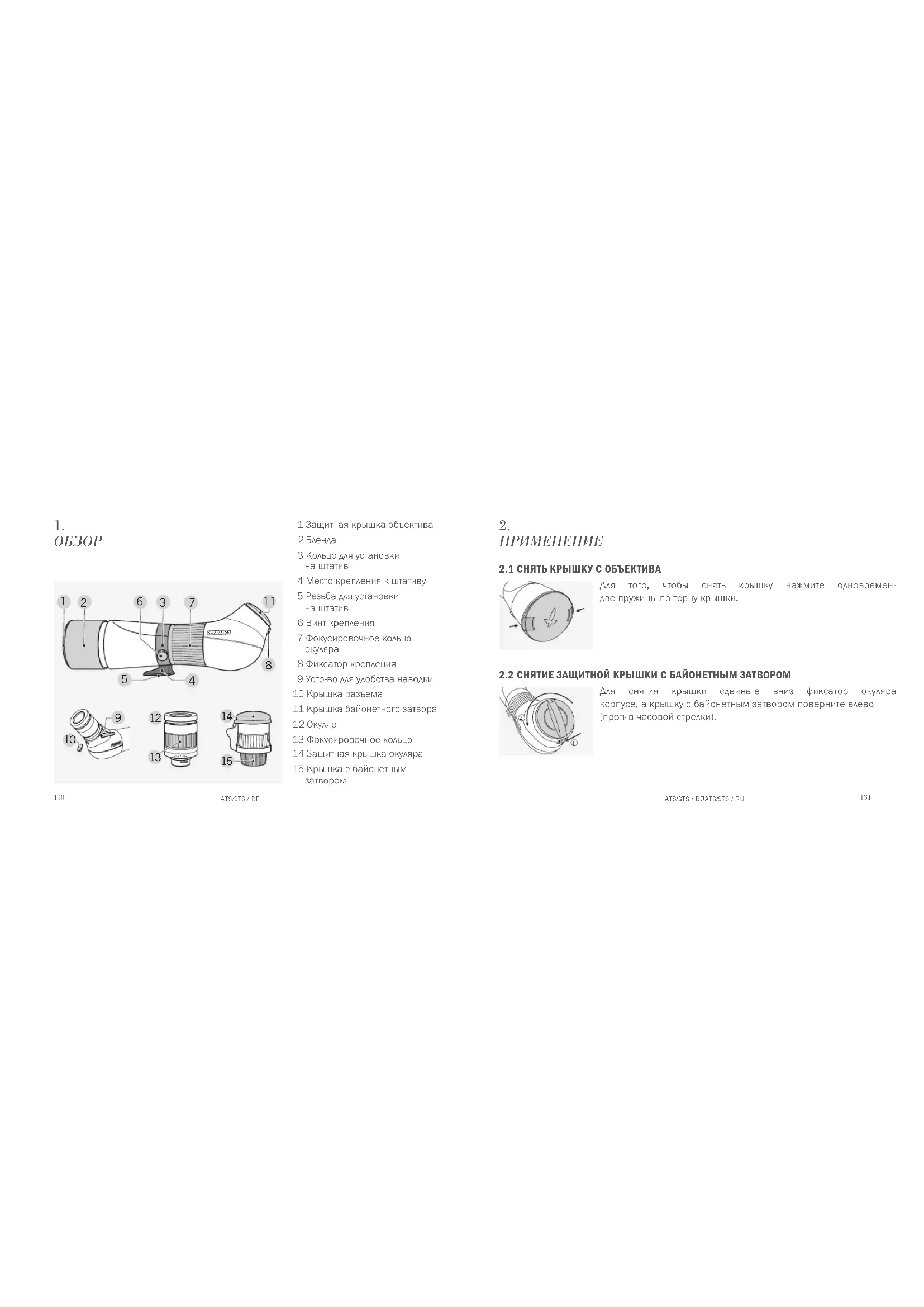 Встроенная выдвигаемая солнцезащитная бленда защищает наблюдаетеля от яркого света, а также предохраняетобъективотпопаданиянанегокапельдождя. Бленда устанавливается и убирается легким вращением. В рабочем и не рабочем положении бленда фиксируется. Защитную крышку объектива можно устанавливать даже, когдавыдвинутабленда.ATS/STS / DE