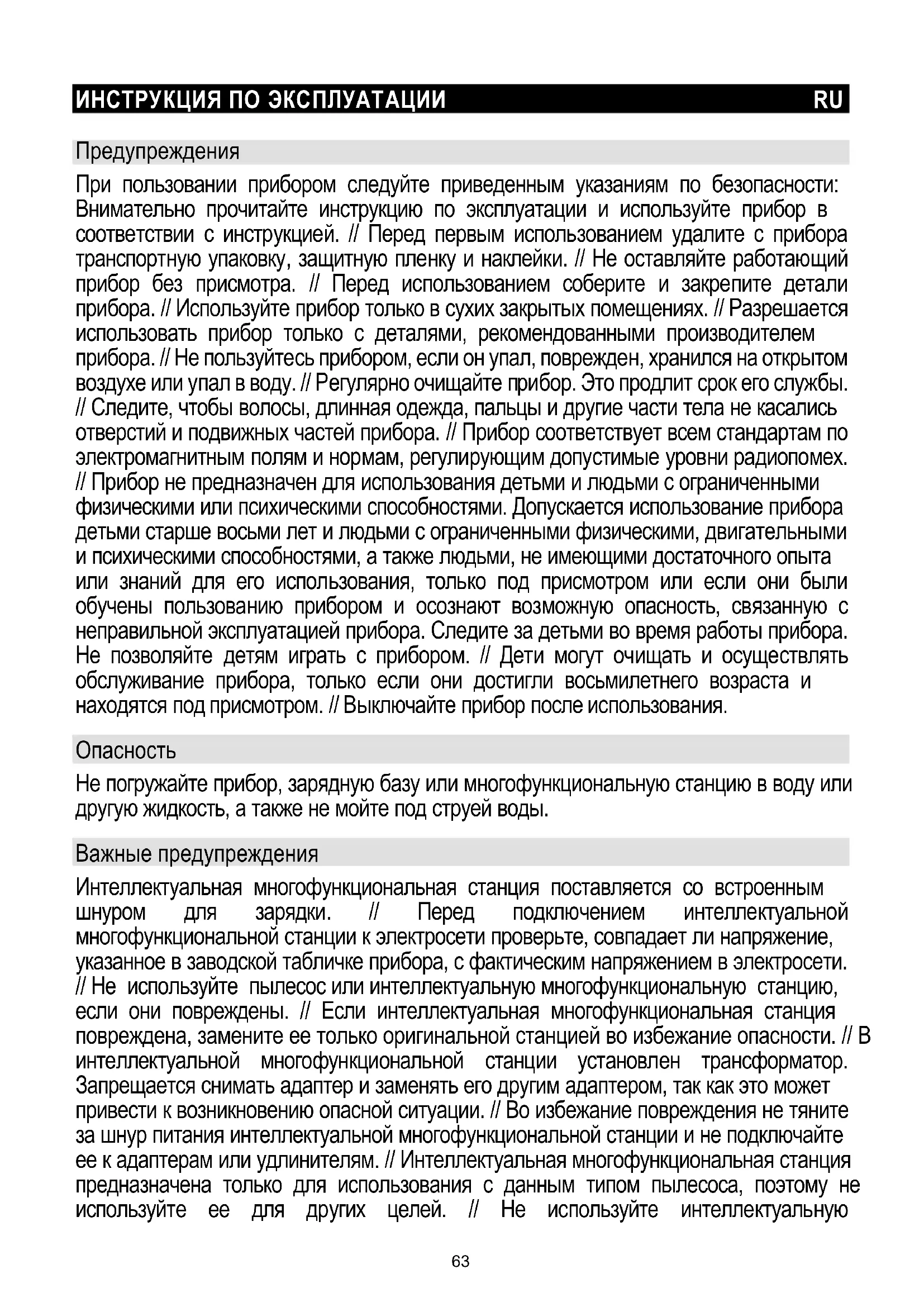 Не погружайте прибор, зарядную базу или многофункциональную станцию в воду или другую жидкость, а также не мойте под струей воды. Важные предупреждения Интеллектуальная многофункциональная станция поставляется со встроенным шнуром для зарядки. // Перед подключением интеллектуальной многофункциональной станции к электросети проверьте, совпадает ли напряжение, указанное в заводской табличке прибора, с фактическим напряжением в электросети. // Не используйте пылесос или интеллектуальную многофункциональную станцию, если они повреждены. // Если интеллектуальная многофункциональная станция повреждена, замените ее только оригинальной станцией во избежание опасности. // В интеллектуальной многофункциональной станции установлен трансформатор. Запрещается снимать адаптер и заменять его другим адаптером, так как это может привести к возникновению опасной ситуации. // Во избежание повреждения не тяните за шнур питания интеллектуальной многофункциональной станции и не подключайте ее к адаптерам или удлинителям. // Интеллектуальная многофункциональная станция предназначена только для использования с данным типом пылесоса, поэтому не используйте ее для других целей. // Не используйте интеллектуальную 63многофункциональную станцию без установленного мешка для пыли и фильтра. // Перед очисткой отключите интеллектуальную многофункциональную станцию от электросети. // Заряжайте пылесос только с помощью интеллектуальной многофункциональной станции. // Пылесос невозможно включить во время его зарядки на интеллектуальной многофункциональной станции. // Не используйте пылесос без фильтров или установленного блока фильтров. // Не блокируйте отверстия для выхода воздуха во время уборки пылесосом. // Прибор предназначен для домашнего использования для уборки внутри помещений. // Следите, чтобы воздухозаборные отверстия были открыты, чтобы через них мог свободно проходить воздух. Это обеспечивает оптимальную и постоянную мощность всасывания прибора. Рекомендуется регулярно очищать отверстия трубки и удалять пыль, волосы и другой мусор, которые могут препятствовать свободному прохождению воздуха. // Не используйте прибор для уборки неостывшего пепла, опилок, окурков, спичек, жидкостей (например, воды, пены для ковров), острых или заостренных предметов (осколков и т. п.). // Не приближайте всасывающее отверстие к лицу или телу. // Не используйте прибор для уборки строительного мусора (мелкого песка, извести, цемента) и тонера для принтеров. Это может привести поломке прибора. Поиск и устранение неисправностей Неисправность Возможная причина
