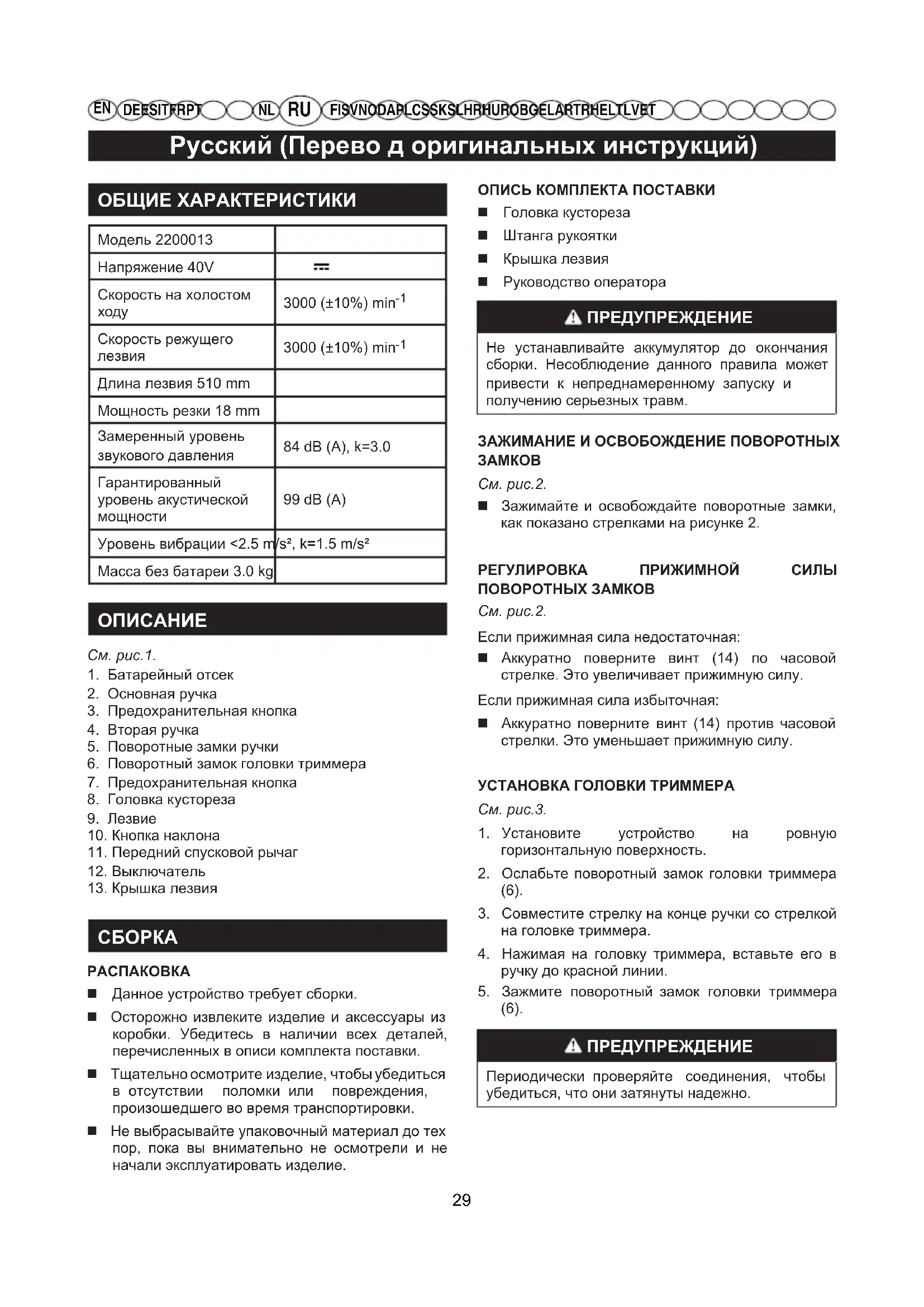 FI SV NO DA PL CS SK SL HR HU RO BG EL AR TR HE LT LV ET ОБЩИЕ ХАРАКТЕРИСТИКИ Модель 2200013Напряжение 40V Скорость на холостом 3000 (±10%) min Скорость режущего лезвия3000 (±10%) min Длина лезвия 510 mmМощность резки 18 mmЗамеренный уровень звукового давления84 dB (A), k=3.0Гарантированный уровень акустической мощности99 dB (A)Уровень вибрации <2.5 m/s², k=1.5 m/s²Масса без батареи 3.0 kg См. рис.1.1. Батарейный отсек2. Основная ручка3. Предохранительная кнопка4. Вторая ручка5. Поворотные замки ручки6. Поворотный замок головки триммера7. Предохранительная кнопка8. Головка кустореза9. Лезвие10. Кнопка наклона11. Передний спусковой рычаг12. Выключатель13. Крышка лезвия РАСПАКОВКА Данное устройство требует сборки. Осторожно извлеките изделие и аксессуары из коробки. Убедитесь в наличии всех деталей, перечисленных в описи комплекта поставки. Тщательно осмотрите изделие, чтобы убедиться в отсутствии поломки или повреждения, произошедшего во время транспортировки. Не выбрасывайте упаковочный материал до тех пор, пока вы внимательно не осмотрели и не начали эксплуатировать изделие.ОПИСЬ КОМПЛЕКТА ПОСТАВКИ Головка кустореза Штанга рукоятки Крышка лезвия Руководство оператора ПРЕДУПРЕЖДЕНИЕ Не устанавливайте аккумулятор до окончания сборки. Несоблюдение данного правила может привести к непреднамеренному запуску и получению серьезных травм.ЗАЖИМАНИЕ И ОСВОБОЖДЕНИЕ ПОВОРОТНЫХ ЗАМКОВСм. рис.2. Зажимайте и освобождайте поворотные замки, как показано стрелками на рисунке 2.РЕГУЛИРОВКА ПРИЖИМНОЙ СИЛЫ ПОВОРОТНЫХ ЗАМКОВСм. рис.2.Если прижимная сила недостаточная: Аккуратно поверните винт (14) по часовой стрелке. Это увеличивает прижимную силу.Если прижимная сила избыточная: Аккуратно поверните винт (14) против часовой стрелки. Это уменьшает прижимную силу.УСТАНОВКА ГОЛОВКИ ТРИММЕРАСм. рис.3.