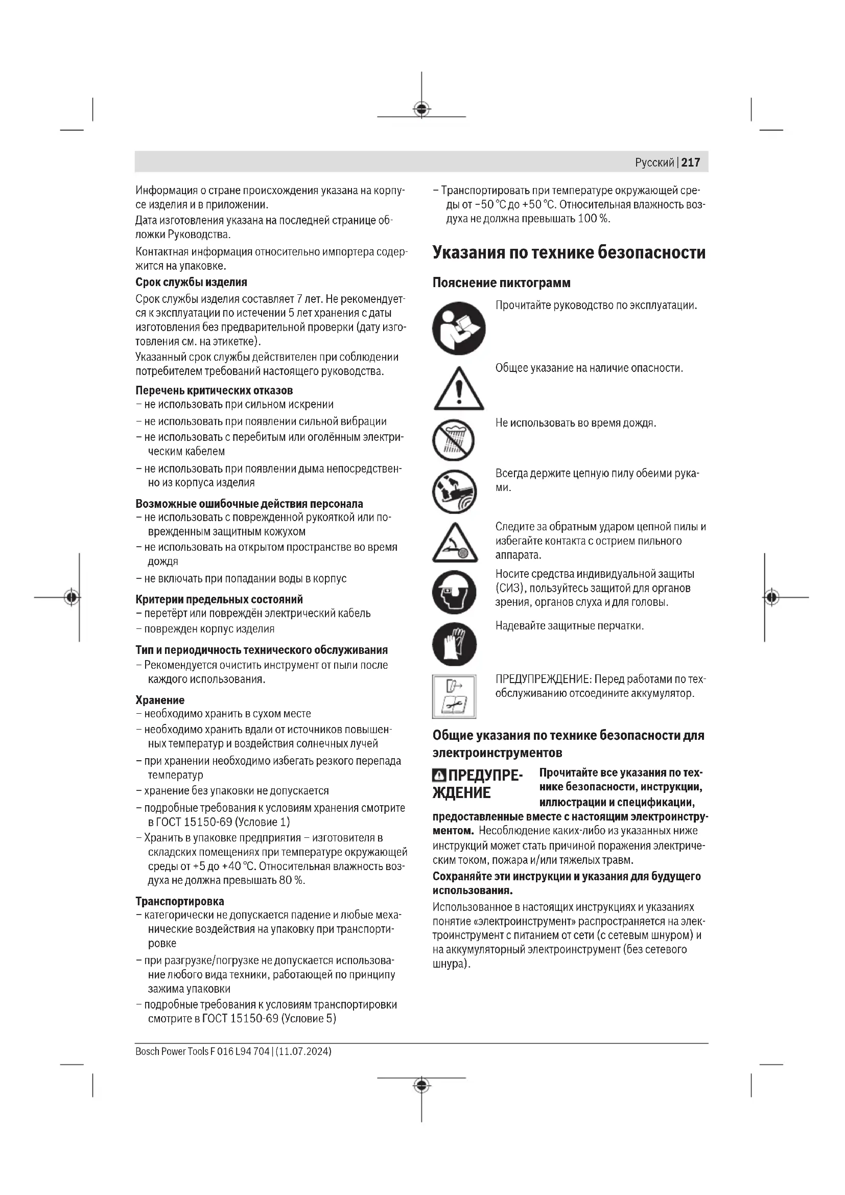 Toлько для стран Евразийского экономического союза (Таможенного союза) В состав эксплуатационных документов, предусмотрен- ных изготовителем для продукции, могут входить настоя- щее руководство по эксплуатации, а также приложения. Информация о подтверждении соответствия содержится в приложении. F 016 L94 704 | (11.07.2024) Bosch Power ToolsРусский | 217 Информация о стране происхождения указана на корпу- се изделия и в приложении. Дата изготовления указана на последней странице об- ложки Руководства. Контактная информация относительно импортера содер- жится на упаковке. Срок службы изделия Срок службы изделия составляет 7 лет. Не рекомендует- ся к эксплуатации по истечении 5 лет хранения с даты изготовления без предварительной проверки (дату изго- товления см. на этикетке). Указанный срок службы действителен при соблюдении потребителем требований настоящего руководства. Перечень критических отказов – не использовать при сильном искрении – не использовать при появлении сильной вибрации – не использовать с перебитым или оголённым электри- ческим кабелем – не использовать при появлении дыма непосредствен- но из корпуса изделия Возможные ошибочные действия персонала – не использовать с поврежденной рукояткой или по- врежденным защитным кожухом – не использовать на открытом пространстве во время