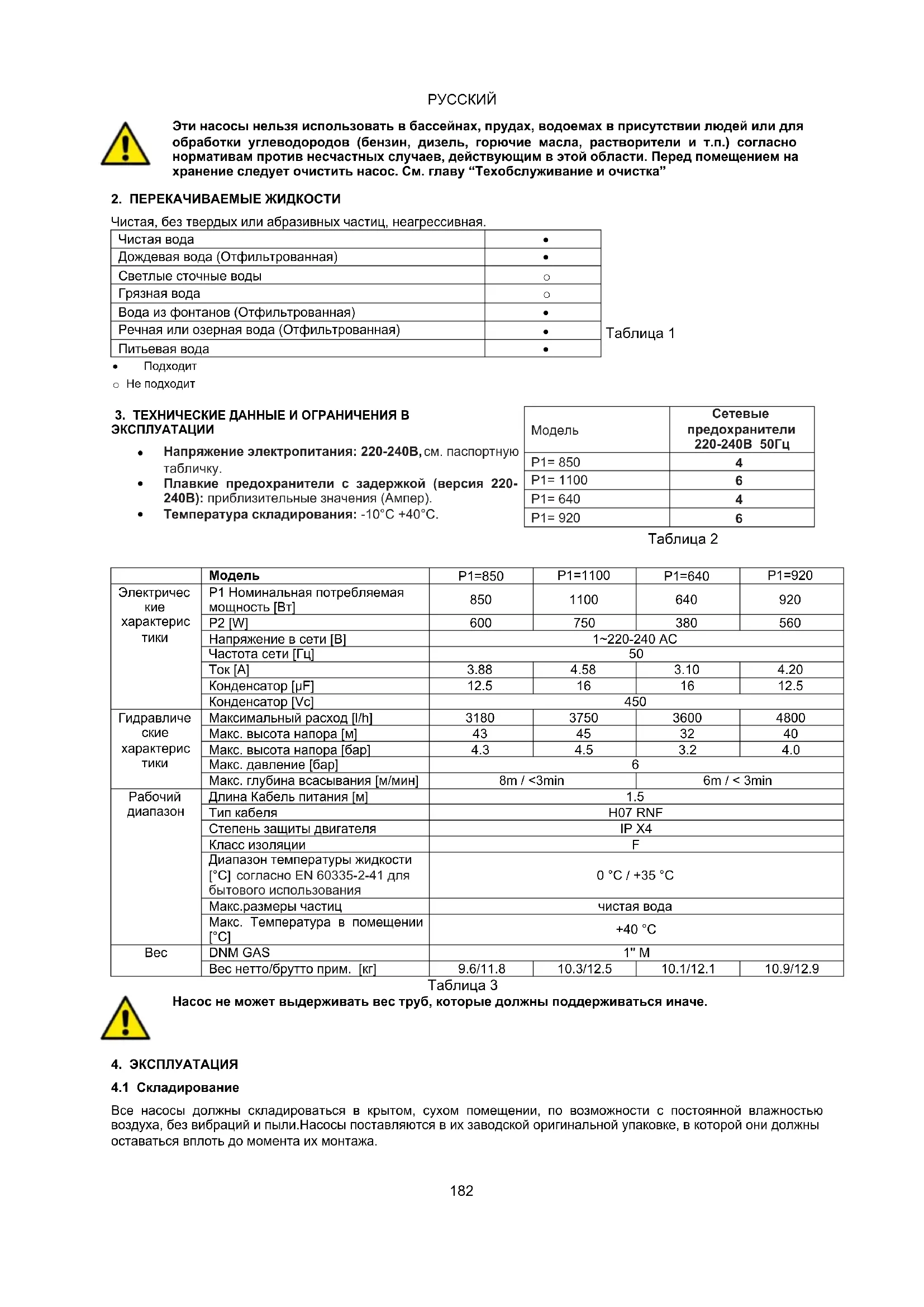 Эти насосы нельзя использовать в бассейнах, прудах, водоемах в присутствии людей или для обработки углеводородов (бензин, дизель, горючие масла, растворители и т.п.) согласно нормативам против несчастных случаев, действующим в этой области. Перед помещением на хранение следует очистить насос. См. главу “Техобслуживание и очистка”