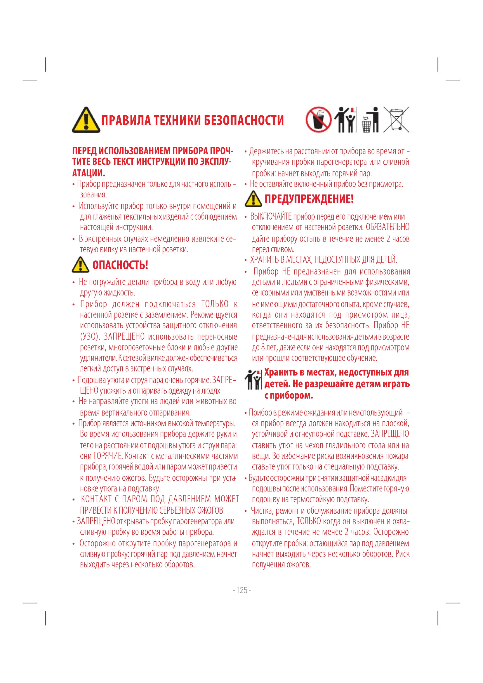 ждался в течение не менее 2 часов. Осторожно открутите пробки: остающийся пар под давлением начнет выходить через несколько оборотов. Риск получения ожогов. Хранить в местах, недоступных для детей. Не разрешайте детям играть с прибором. ПРЕДУПРЕЖДЕНИЕ! ОПАСНОСТЬ!- 126 -
