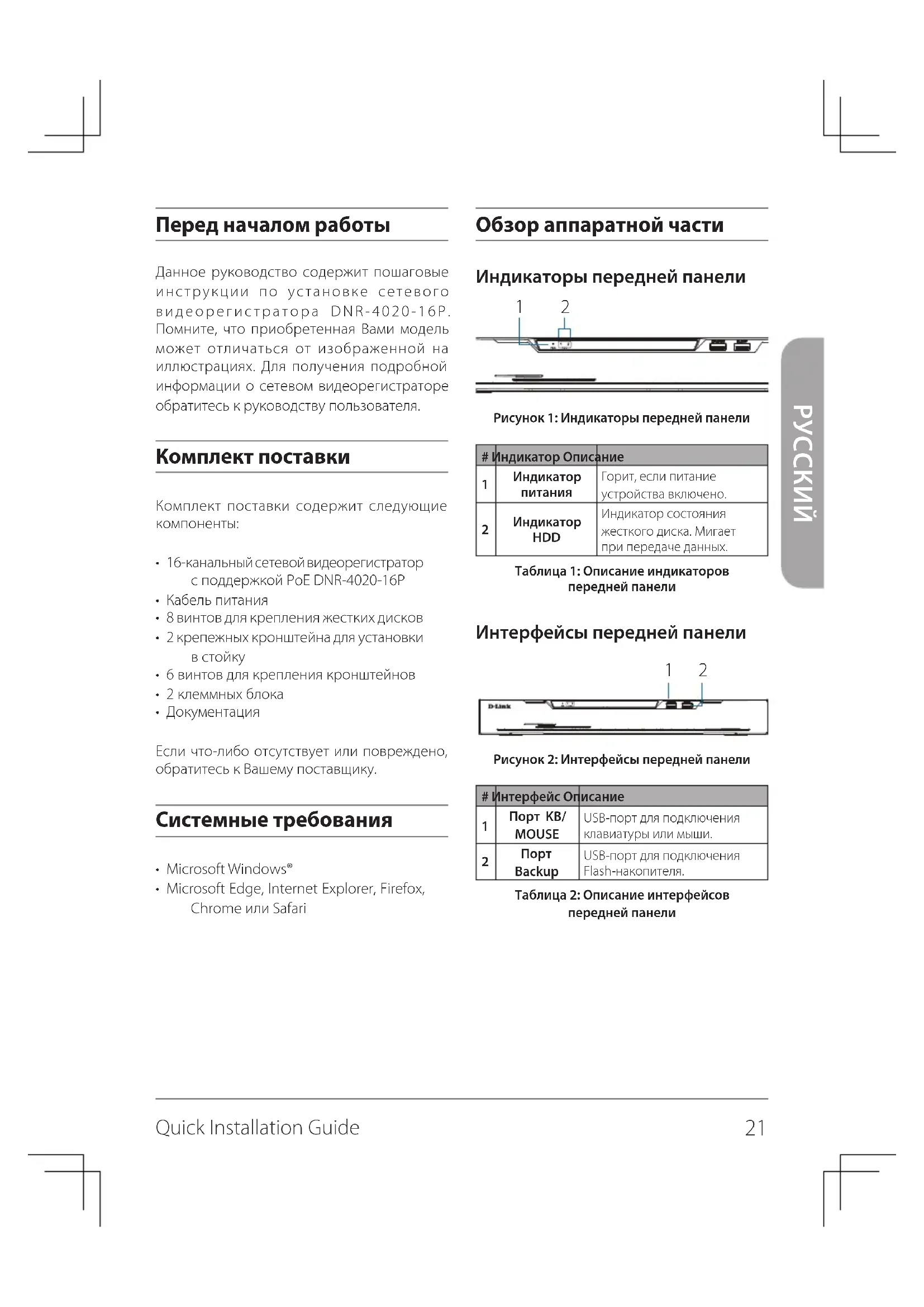 HDD Индикатор состояния жесткого диска. Мигает при передаче данных.Таблица 1: Описание индикаторов передней панели Интерфейсы передней панели Рисунок 2: Интерфейсы передней панели# Интерфейс Описание Порт KB/MOUSEUSB-порт для подключения клавиатуры или мыши. Порт BackupUSB-порт для подключения Flash-накопителя.Таблица 2: Описание интерфейсов передней панели Перед началом работы Данное руководство содержит пошаговые инструкции по установке сетевого видеорегистратора DNR-4020-16P. Помните, что приобретенная Вами модель может отличаться от изображенной на иллюстрациях. Для получения подробной информации о сетевом видеорегистраторе обратитесь к руководству пользователя. Комплект поставки Комплект поставки содержит следующие компоненты: