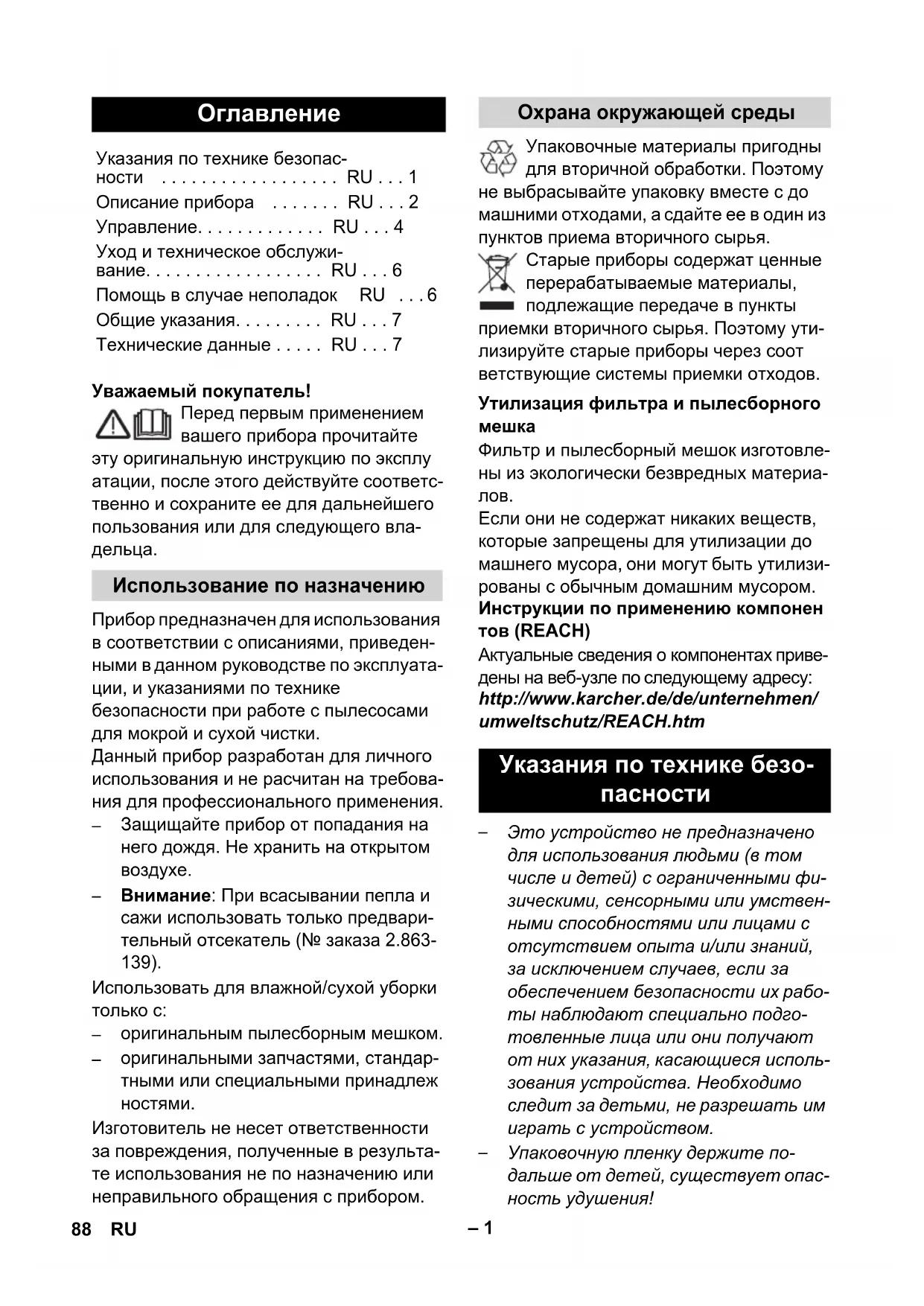 Указания по технике безопас- ности . . . . . . . . . . . . . . . . . . RU . . . 1 Описание прибора . . . . . . . RU . . . 2 Управление. . . . . . . . . . . . . RU . . . 4 Уход и техническое обслужи- вание. . . . . . . . . . . . . . . . . . RU . . . 6 Помощь в случае неполадок RU . . . 6 Общие указания. . . . . . . . . RU . . . 7 Технические данные . . . . . RU . . . 7 Использование по назначению Охрана окружающей среды Утилизация фильтра и пылесборного