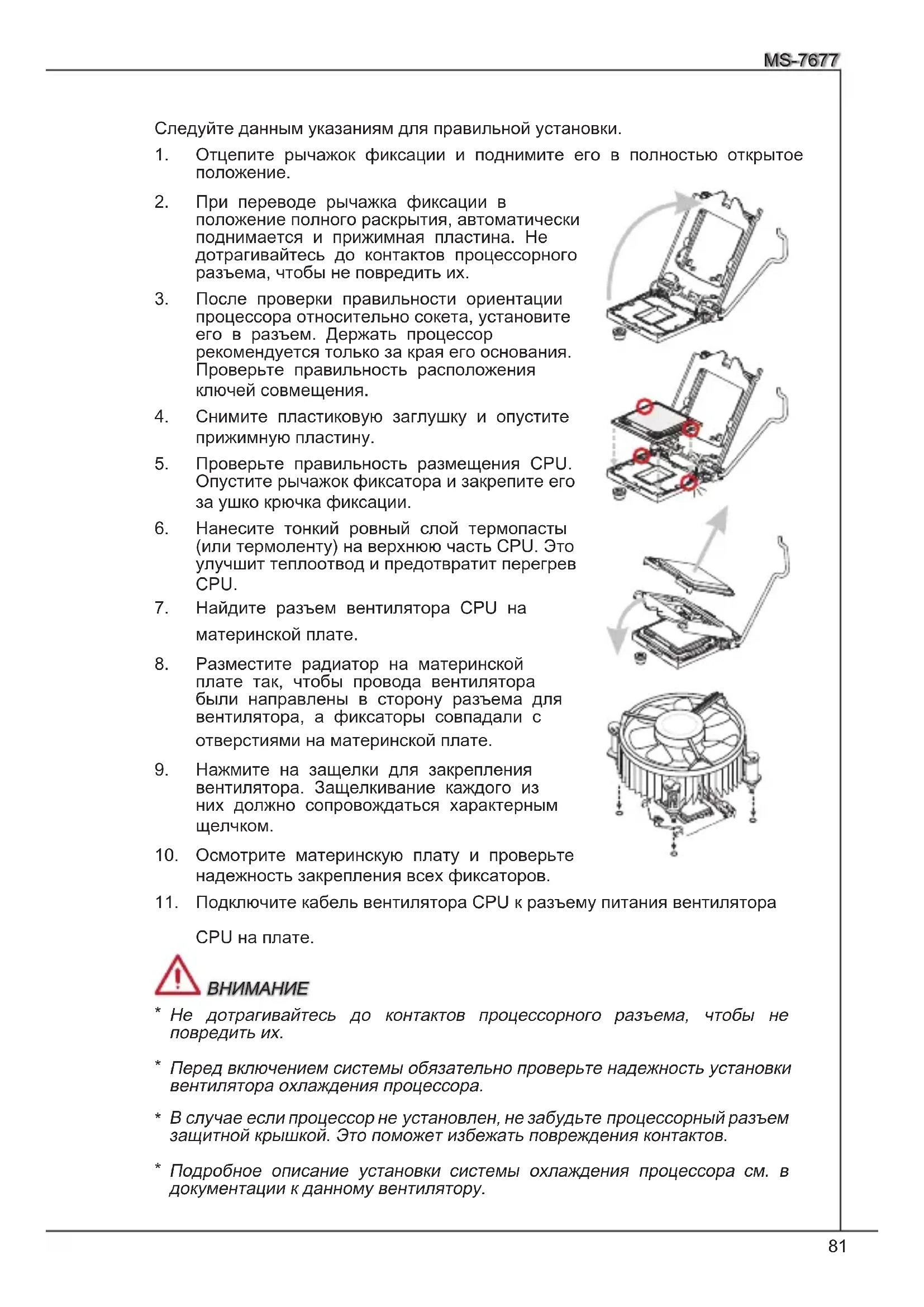 MS-7677 Следуйте данным указаниям для правильной установки. Отцепите рычажок фиксации и поднимите его в полностью открытое