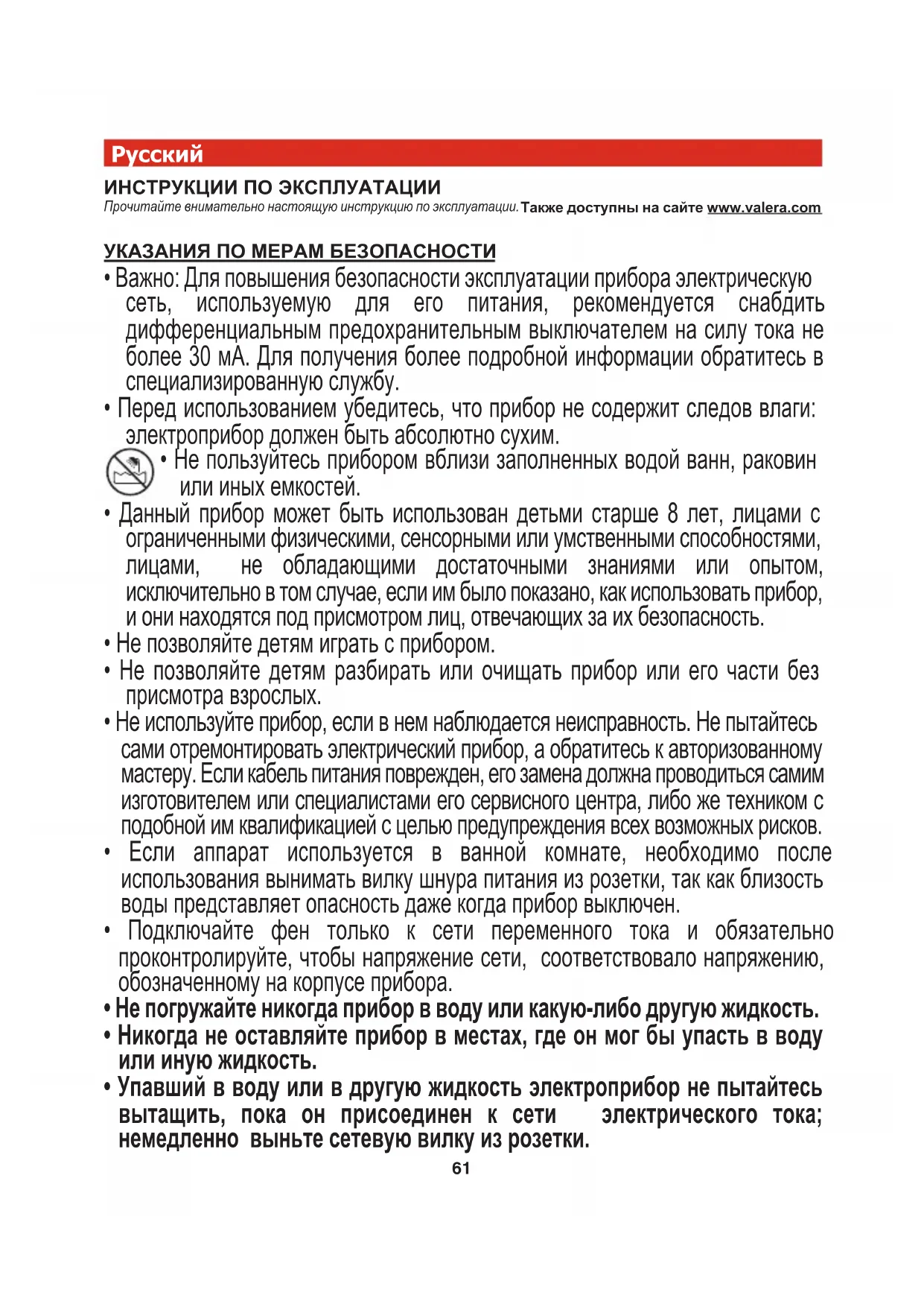 ИНСТРУКЦИИ ПО ЭКСПЛУАТАЦИИ Прочитайте внимательно настоящую инструкцию по эксплуатации. Также доступны на сайте www.valera.com УКАЗАНИЯ ПО МЕРАМ БЕЗОПАСНОСТИ