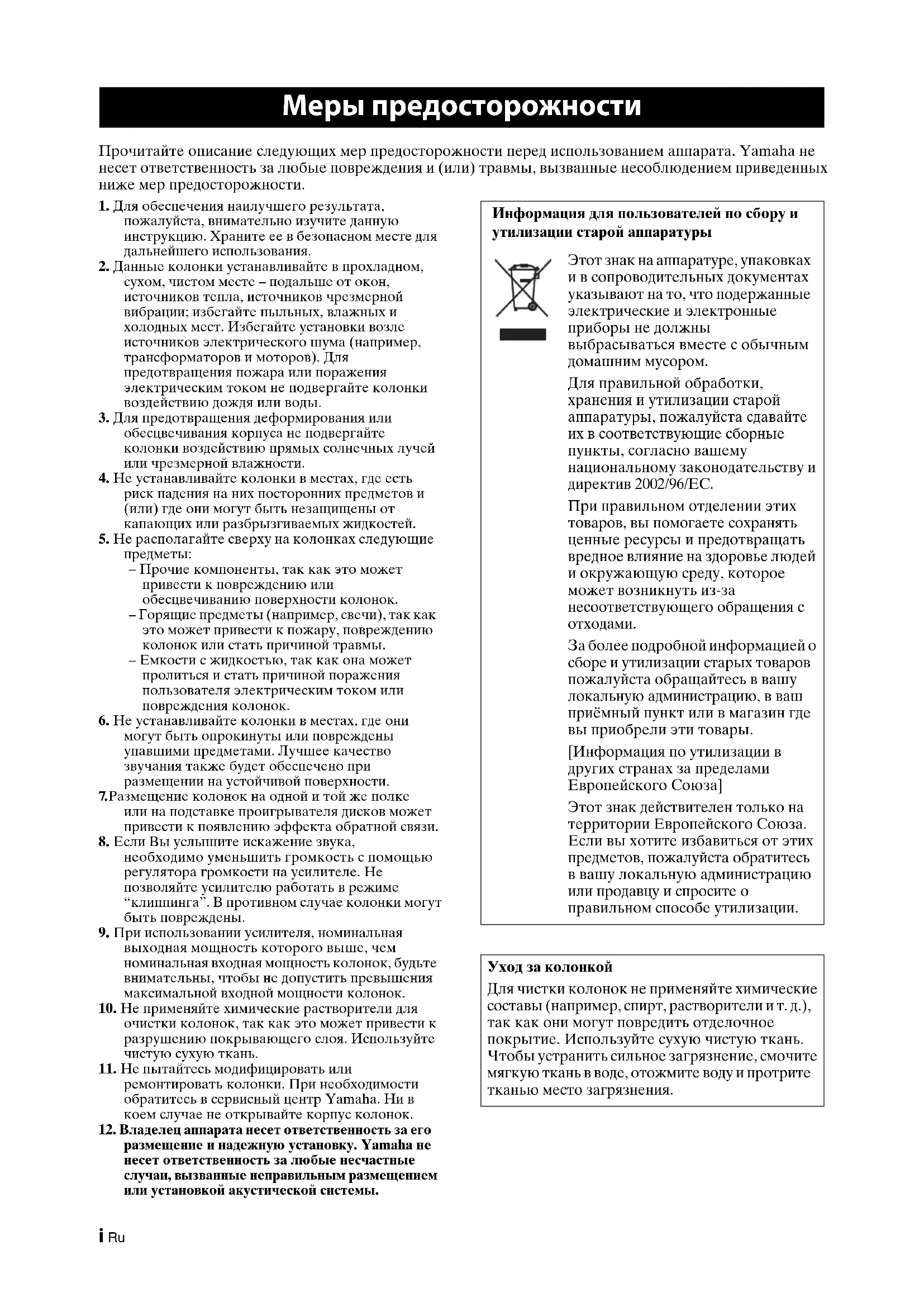 размещение и надежную установку. Yamaha не несет ответственность за любые несчастные случаи, вызванные неправильным размещением или установкой акустической системы. Меры предосторожности Информация для пользователей по сбору и утилизации старой аппаратуры Этот знак на аппаратуре, упаковках и в сопроводительных документах указывают на то, что подержанные электрические и электронные приборы не должны выбрасываться вместе с обычным домашним мусором. Для правильной обработки, хранения и утилизации старой аппаратуры, пожалуйста сдавайте их в соответствующие сборные пункты, согласно вашему национальному законодательству и директив 2002/96/EC. При правильном отделении этих товаров, вы помогаете сохранять ценные ресурсы и предотвращать вредное влияние на здоровье людей и окружающую среду, которое может возникнуть из-за несоответствующего обращения с