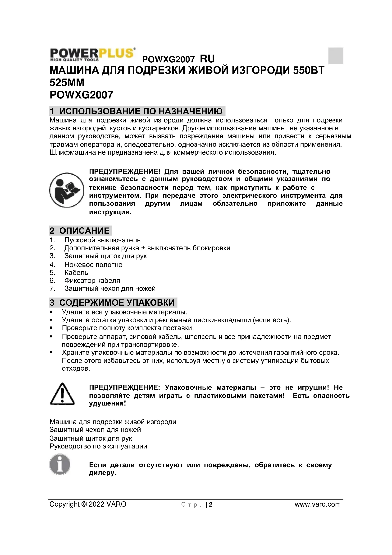 - 13 ДЕКЛАРАЦИЯ О СООТВЕТСТВИИ POWXG2007 RU Copyright © 2022 VARO С т р . | 2 www.varo.com МАШИНА ДЛЯ ПОДРЕЗКИ ЖИВОЙ ИЗГОРОДИ 550ВТ 525ММ POWXG2007 1 ИСПОЛЬЗОВАНИЕ ПО НАЗНАЧЕНИЮ Машина для подрезки живой изгороди должна использоваться только для подрезки живых изгородей, кустов и кустарников. Другое использование машины, не указанное в данном руководстве, может вызвать повреждение машины или привести к серьезным травмам оператора и, следовательно, однозначно исключается из области применения. Шлифмашина не предназначена для коммерческого использования. ПРЕДУПРЕЖДЕНИЕ! Для вашей личной безопасности, тщательно ознакомьтесь с данным руководством и общими указаниями по технике безопасности перед тем, как приступить к работе с инструментом. При передаче этого электрического инструмента для пользования другим лицам обязательно приложите данные инструкции. 2 ОПИСАНИЕ p. 9