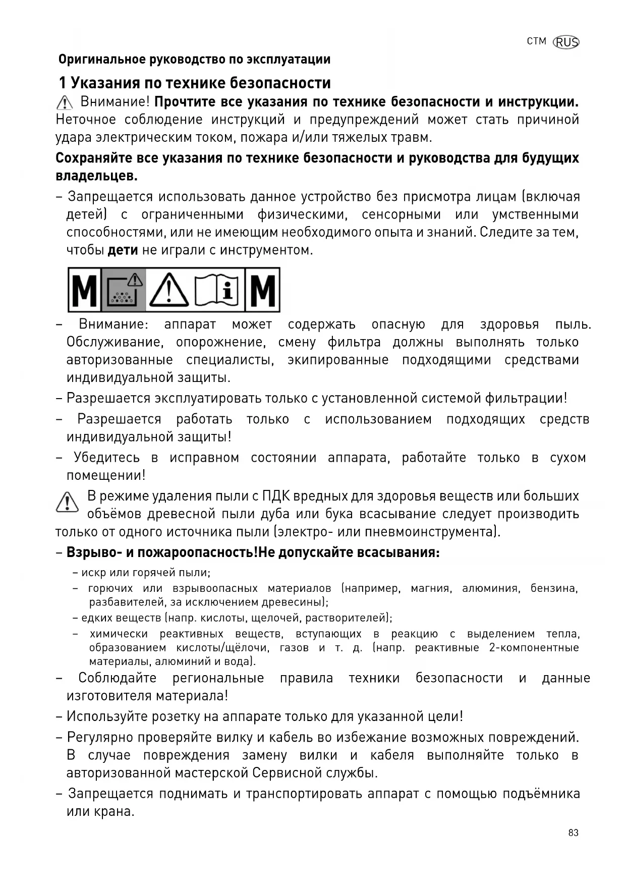 Взрыво- и пожароопасность!Не допускайте всасывания: – искр или горячей пыли; – горючих или взрывоопасных материалов (например, магния, алюминия, бензина, разбавителей, за исключением древесины); – едких веществ (напр. кислоты, щелочей, растворителей); – химически реактивных веществ, вступающих в реакцию с выделением тепла, образованием кислоты/щёлочи, газов и т. д. (напр. реактивные 2-компонентные материалы, алюминий и вода). – Соблюдайте региональные правила техники безопасности и данные изготовителя материала! – Используйте розетку на аппарате только для указанной цели! – Регулярно проверяйте вилку и кабель во избежание возможных повреждений. В случае повреждения замену вилки и кабеля выполняйте только в авторизованной мастерской Сервисной службы. – Запрещается поднимать и транспортировать аппарат с помощью подъёмника или крана.84 CTM RUS 2Символы 3Составные части инструмента Иллюстрации находятся в начале руководства по эксплуатации. 4 Технические данные СимволЗначение Предупреждение об общей опасности Предупреждение об ударе током Прочтите руководство по эксплуатации и указания по технике безопасности! Используйте респиратор! Инструкция, рекомендация Инструкция по использованию
