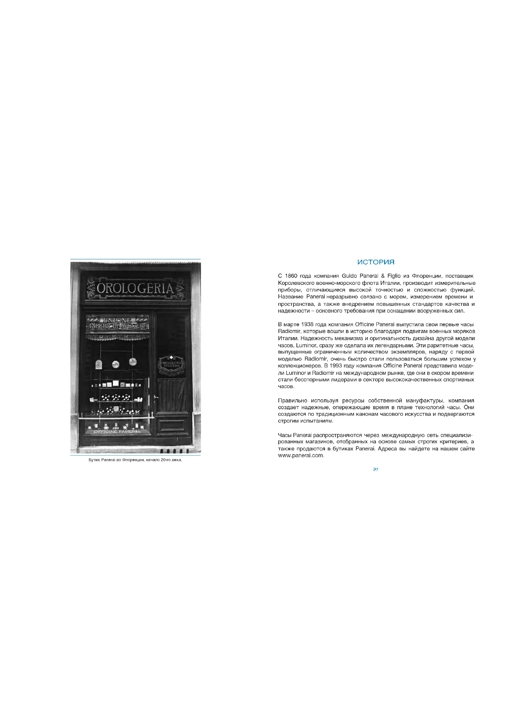 Правильно используя ресурсы собственной мануфактуры, компания создает надежные, опережающие время в плане технологий часы. Они создаются по традиционным канонам часового искусства и подвергаются строгим испытаниям. Часы Panerai распространяются через международную сеть специализи- рованных магазинов, отобранных на основе самых строгих критериев, а также продаются в бутиках Panerai. Адреса вы найдете на нашем сайте www.panerai.com. Бутик Panerai во Флоренции, начало 20-го века. Lg3_PAA02686_09.12_PAA02686 10/09/12 11.27 Pagina 909392
