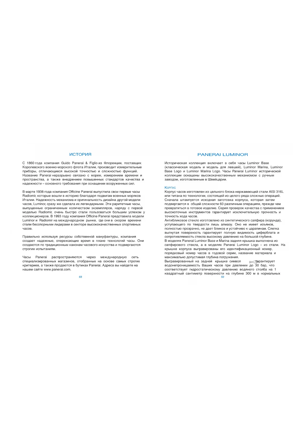 Корпус часов изготовлен из цельного блока нержавеющей стали AISI 316L или титана по технологии, состоящей из целого ряда сложных операций. Сначала штампуется исходная заготовка корпуса, которая затем подвергается в общей сложности 60 различным операциям, прежде чем превратиться в готовое изделие. Серия проверок качества с применением высокоточных инструментов гарантирует исключительную прочность и точность хода часов. Антибликовое стекло изготовлено из синтетического сапфира (корунда), уступающего по твердости лишь алмазу. Оно не имеет изъянов, полностью прозрачно, не дает бликов и устойчиво к царапинам. Слегка выгнутая поверхность гарантирует полную видимость циферблата и сопротивляемость стекла высокому давлению на большой глубине. В моделях Panerai Luminor Base и Marina задняя крышка выполнена из сапфирового стекла, а в моделях Panerai Luminor Logo – из стали. На крышке корпуса выгравированы его идентификационный номер, порядковый номер часов в годовой серии, название материала и максимально допустимая глубина погружения. Выгравированный на задней крышке символ гарантирует водонепроницаемость Ваших часов при давлении до 30 бар, что соответствует гидростатическому давлению водяного столба на 1 квадратный сантиметр поверхности на глубине 300 м в нормальных