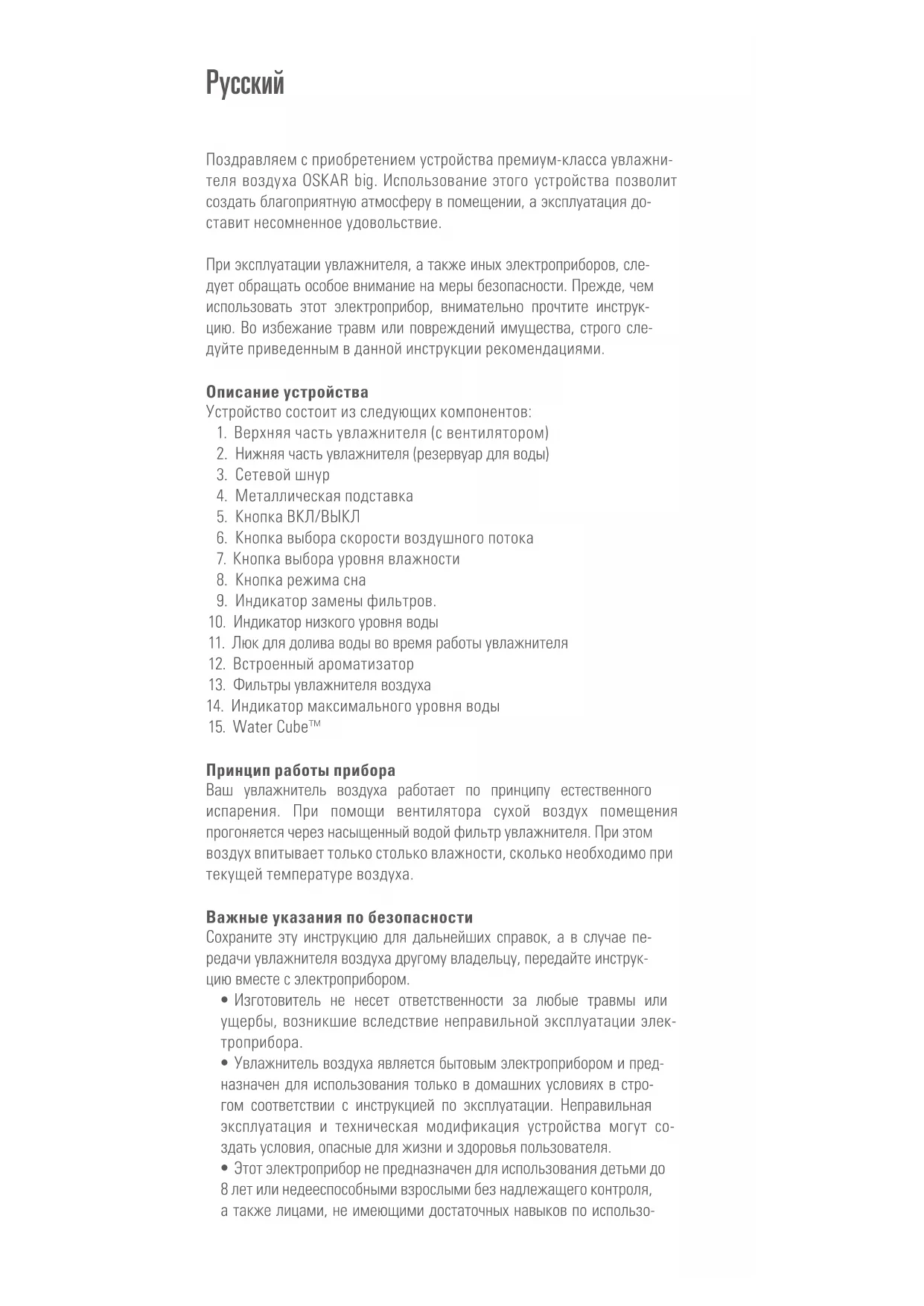 Mått 470 x 290 x 200 mm (bredd x höjd x djup) Vikt 4.7 kg Tankkapacitet 6 liter Ljudnivå 25 – 46 dB(A) Uppfyller EU:s regler CE / WEEE / RoHS / EAC Alla rättigheter för tekniska ändringar förbehållesРусский Поздравляем с приобретением устройства премиум-класса увлажни- теля воздуха OSKAR big. Использование этого устройства позволит создать благоприятную атмосферу в помещении, а эксплуатация до- ставит несомненное удовольствие. При эксплуатации увлажнителя, а также иных электроприборов, сле- дует обращать особое внимание на меры безопасности. Прежде, чем использовать этот электроприбор, внимательно прочтите инструк- цию. Во избежание травм или повреждений имущества, строго сле- дуйте приведенным в данной инструкции рекомендациями. Описание устройства Устройство состоит из следующих компонентов: