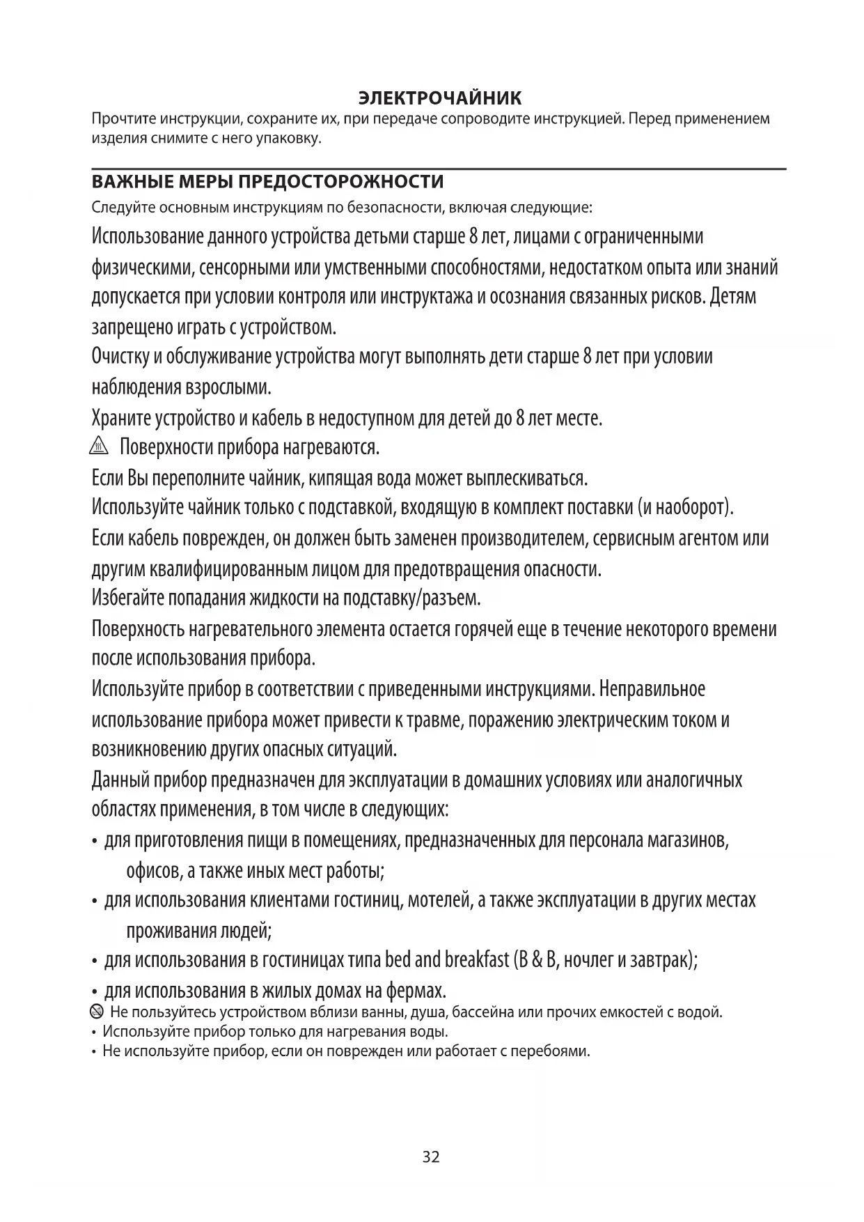 AE32 ЭЛЕКТРОЧАЙНИК Прочтите инструкции, сохраните их, при передаче сопроводите инструкцией. Перед применением изделия снимите с него упаковку. ВАЖНЫЕ МЕРЫ ПРЕДОСТОРОЖНОСТИ Следуйте основным инструкциям по безопасности, включая следующие: Использование данного устройства детьми старше 8 лет, лицами с ограниченными физическими, сенсорными или умственными способностями, недостатком опыта или знаний допускается при условии контроля или инструктажа и осознания связанных рисков. Детям запрещено играть с устройством. Очистку и обслуживание устройства могут выполнять дети старше 8 лет при условии наблюдения взрослыми. Храните устройство и кабель в недоступном для детей до 8 лет месте. h Поверхности прибора нагреваются. Если Вы переполните чайник, кипящая вода может выплескиваться. Используйте чайник только с подставкой, входящую в комплект поставки (и наоборот). Если кабель поврежден, он должен быть заменен производителем, сервисным агентом или другим квалифицированным лицом для предотвращения опасности. Избегайте попадания жидкости на подставку/разъем. Поверхность нагревательного элемента остается горячей еще в течение некоторого времени после использования прибора. Используйте прибор в соответствии с приведенными инструкциями. Неправильное использование прибора может привести к травме, поражению электрическим током и возникновению других опасных ситуаций. Данный прибор предназначен для эксплуатации в домашних условиях или аналогичных областях применения, в том числе в следующих:
