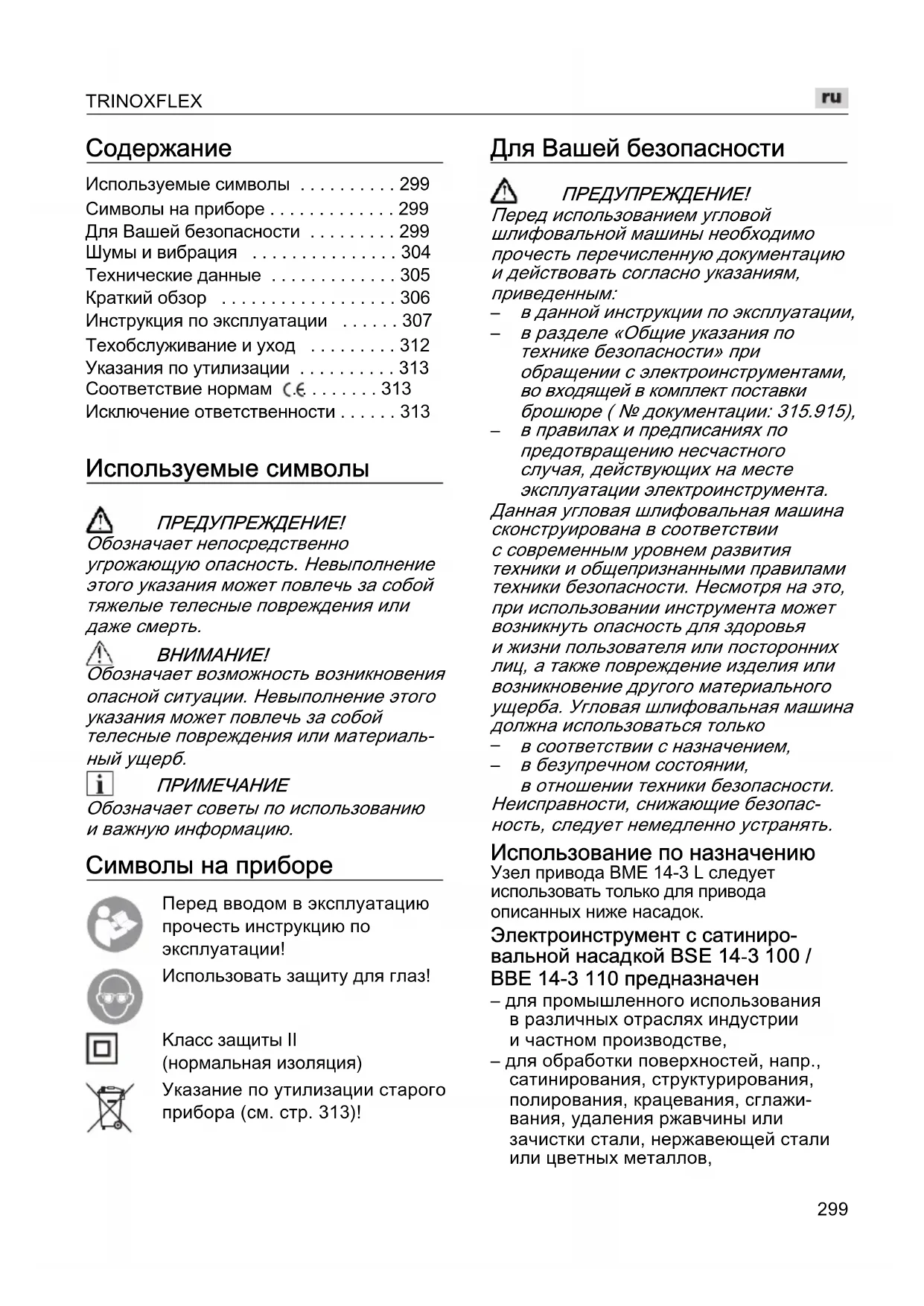 Обозначает советы по использованию и важную информацию. Символы на приборе Перед вводом в эксплуатацию прочесть инструкцию по эксплуатации! Использовать защиту для глаз! Kласс защиты II (нормальная изоляция) Указание по утилизации старого прибора (см. стр. 313)! Для Вашей безопасности ПРЕДУПРЕЖДЕHИЕ! Перед использованием угловой шлифовальной машины необходимо прочесть перечисленную документацию и действовать согласно указаниям, приведенным: