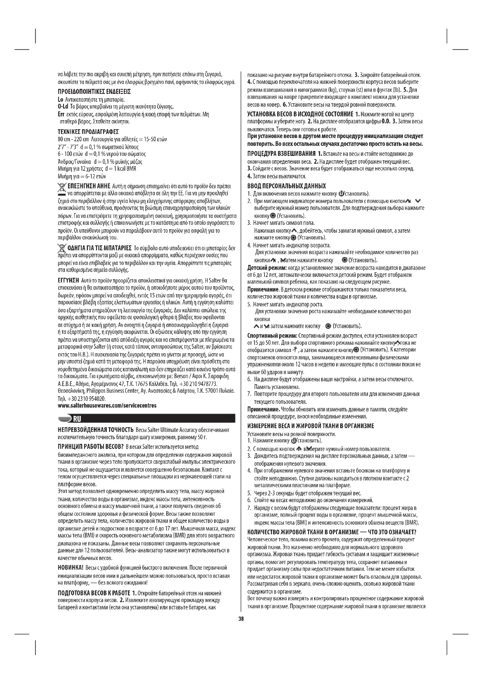 Мужчина/женщина d = 0,1 % мышечной массы Память на 12 пользователей d = 1 ккал (1 килокалория) интенсивности Детский режим = 6-12 лет основного обмена веществ ПОЯСНЕНИЕ WEEE Данная маркировка означает, что в странах Европы не допускается утилизировать прибор вместе с другими бытовыми отходами. Чтобы не нанести ущерба окружающей среде и здоровью населения в результате неверной утилизации отходов, прибор следует сдать на переработку, чтобы обеспечить экологичное повторное использование материальных ресурсов. Верните бывший в употреблении прибор через систему возврата и сбора отходов или свяжитесь с предприятием розничной торговли, где вы приобрели прибор. Там вы сможете сдать этот продукт для экологически безопасной переработки. ИНСТРУКЦИИ К БАТАРЕЯМ Данный символ означает, что батареи не следует утилизировать совместно с бытовым мусором, поскольку они содержат вещества, способные нанести вред окружающей среде и здоровью. Утилизируйте батареи в специально предназначенных для этого приемных пунктах. ГАРАНТИЙНЫЕ Это изделие предназначено только для бытового использования. Компания Salter обязуется осуществлять бесплатный ремонт или замену устройства или любого его элемента в течение 15 лет с момента покупки при условии, что неисправность возникла из-за производственного дефекта. Эта гарантия распространяется на все компоненты, оказывающие влияние на работу весов. Гарантия не распространяется на ухудшение внешнего вида вследствие естественного износа или на повреждения в результате неправильного использования. При самостоятельном вскрытии прибора гарантия аннулируется.41 Покупатель обязан предоставить доказательства приобретения данного устройства и обеспечить его доставку в компанию Salter (или местному агенту, если покупка была произведена за пределами Великобритании). Во избежание повреждений во время транспортировки весы должны быть упакованы соответствующим образом. Это обязательство является дополнением к законным правам потребителя и никоим образом не затрагивает эти права. По вопросам технического обслуживания обращайтесь: OOO Maltum, 2/11 build2, 4th Tverskaya-Yamskaya st, Moscow, 125047, Russia. e-mail info@homedics-russia.ru. www.salterhousewares.com/servicecentres