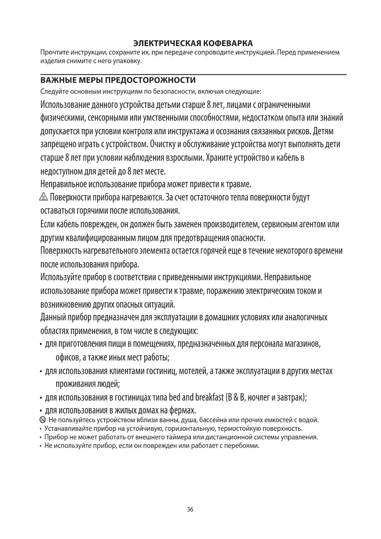 AE36 ЭЛЕКТРИЧЕСКАЯ КОФЕВАРКА Прочтите инструкции, сохраните их, при передаче сопроводите инструкцией. Перед применением изделия снимите с него упаковку. ВАЖНЫЕ МЕРЫ ПРЕДОСТОРОЖНОСТИ Следуйте основным инструкциям по безопасности, включая следующие: Использование данного устройства детьми старше 8 лет, лицами с ограниченными физическими, сенсорными или умственными способностями, недостатком опыта или знаний допускается при условии контроля или инструктажа и осознания связанных рисков. Детям запрещено играть с устройством. Очистку и обслуживание устройства могут выполнять дети старше 8 лет при условии наблюдения взрослыми. Храните устройство и кабель в недоступном для детей до 8 лет месте. Неправильное использование прибора может привести к травме. h Поверхности прибора нагреваются. За счет остаточного тепла поверхности будут оставаться горячими после использования. Если кабель поврежден, он должен быть заменен производителем, сервисным агентом или другим квалифицированным лицом для предотвращения опасности. Поверхность нагревательного элемента остается горячей еще в течение некоторого времени после использования прибора. Используйте прибор в соответствии с приведенными инструкциями. Неправильное использование прибора может привести к травме, поражению электрическим током и возникновению других опасных ситуаций. Данный прибор предназначен для эксплуатации в домашних условиях или аналогичных областях применения, в том числе в следующих: