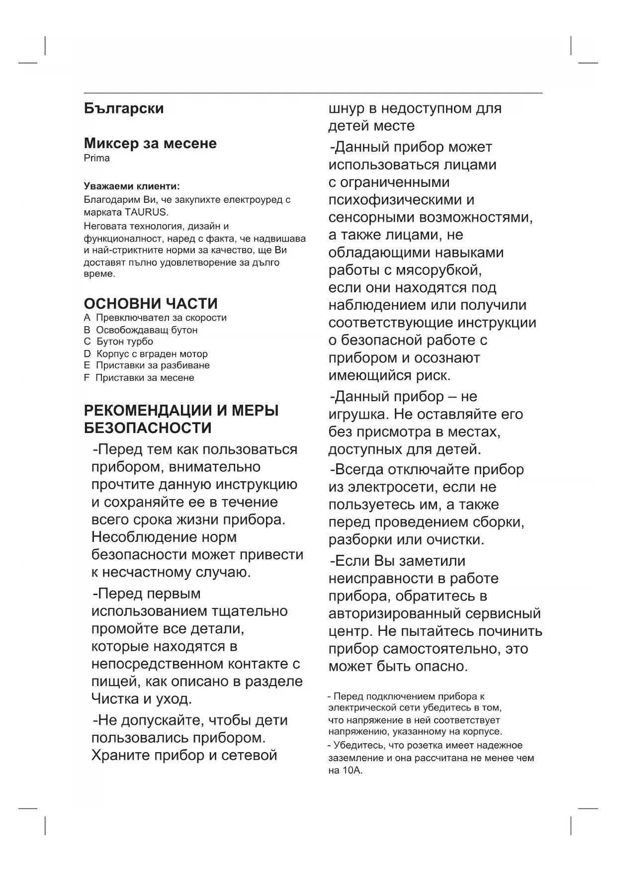 ОСНОВНИ ЧАСТИ A Превключвател за скорости B Освобождаващ бутон C Бутон турбо D Корпус с вграден мотор E Приставки за разбиване F Приставки за месене РЕКОМЕНДАЦИИ И МЕРЫ БЕЗОПАСНОСТИ -Перед тем как пользоваться прибором, внимательно прочтите данную инструкцию и сохраняйте ее в течение всего срока жизни прибора. Несоблюдение норм безопасности может привести к несчастному случаю. -Перед первым использованием тщательно промойте все детали, которые находятся в непосредственном контакте с пищей, как описано в разделе Чистка и уход. -Не допускайте, чтобы дети пользовались прибором. Храните прибор и сетевой шнур в недоступном для детей месте -Данный прибор может использоваться лицами с ограниченными психофизическими и сенсорными возможностями, а также лицами, не обладающими навыками работы с мясорубкой, если они находятся под наблюдением или получили соответствующие инструкции о безопасной работе с прибором и осознают имеющийся риск. -Данный прибор – не игрушка. Не оставляйте его без присмотра в местах, доступных для детей. -Всегда отключайте прибор из электросети, если не пользуетесь им, а также перед проведением сборки, разборки или очистки. -Если Вы заметили неисправности в работе прибора, обратитесь в авторизированный сервисный центр. Не пытайтесь починить прибор самостоятельно, это может быть опасно. - Перед подключением прибора к электрической сети убедитесь в том, что напряжение в ней соответствует напряжению, указанному на корпусе. - Убедитесь, что розетка имеет надежное заземление и она рассчитана не менее чем на 10А.- Вилка электропитания должна соответствовать стандарту розеток, который используется в вашем регионе, который используется в Вашем регионе. Не рекомендуется использовать адаптеры и изменять штыковой контакт. - Рабочее место должно быть чистым и хорошо освещенным. Неаккуратное, плохо освещенное рабочее место чаще становится причиной несчастных случаев. - Во время работы прибора держите его подальше от детей и от прочих посторонних
